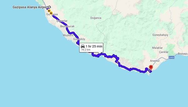 - 78 km, 1 Stunde und 23 Minuten bis zum Flughafen Gazipaşa-Alanya.