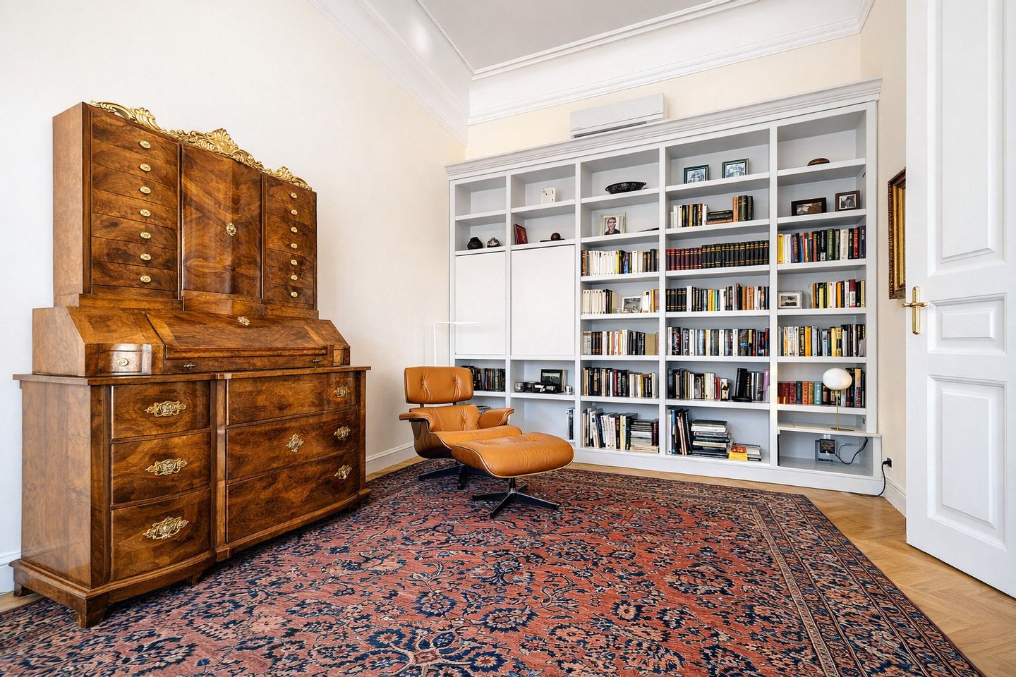 - Eingebaute, hochwertige Schränke und Regale in drei Räumen.