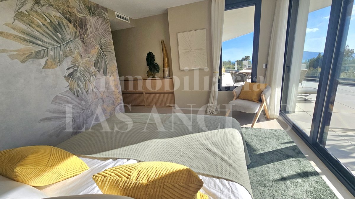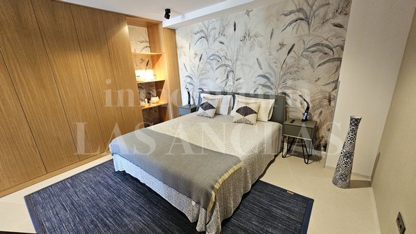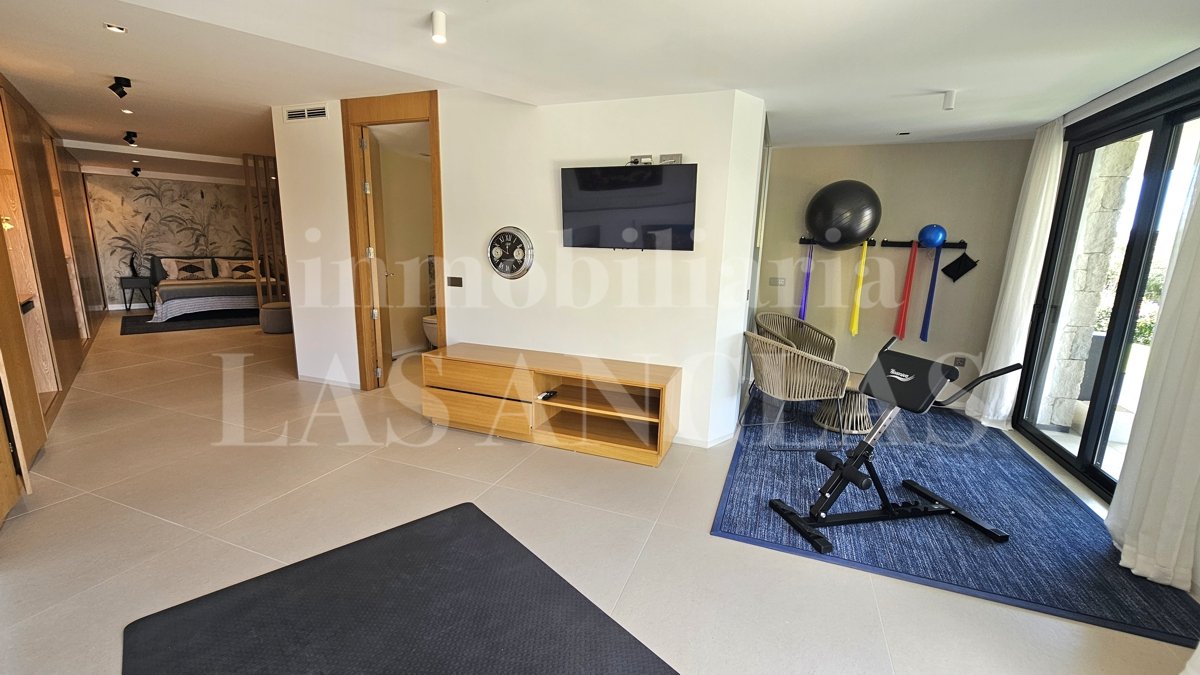 Das Untergeschoss beherbergt ein TV‑Zimmer und drei elegante Schlafzimmer, alle mit en Suite Badezimmern und Ankleidezimmern. Eines davon verfügt zusätzlich über ein Fitnessstudio und alle haben direkten Zugang zur Terrasse sowie zum Garten‑ und Poolbereich.