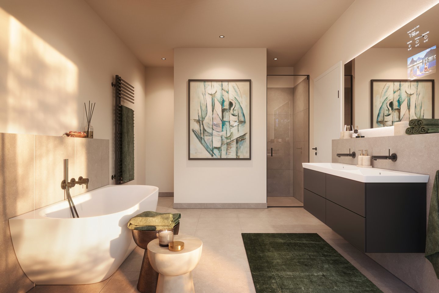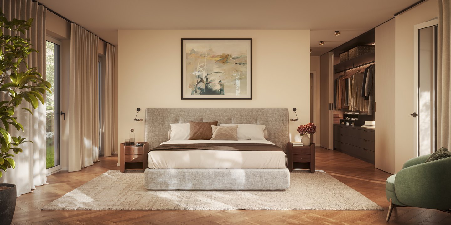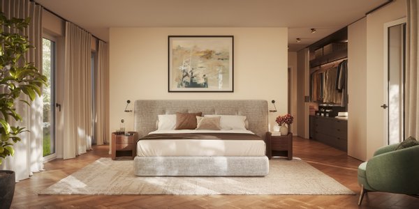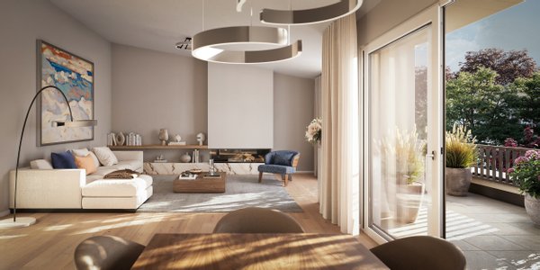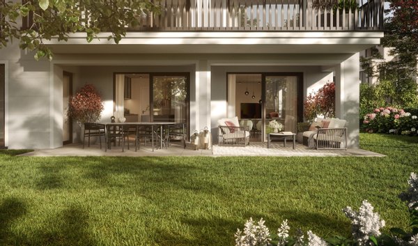 Geradeaus führt eine elegante Flügeltür in den offenen Wohn-, Ess- und Kochbereich, der durch zwei große Schiebetüren Zugang zur Terrasse bietet. Optional ist ein direkter Zugang vom Küchenbereich zum Hauswirtschaftsraum möglich. Der private Garten mit über 350 m² erstreckt sich rund um die Wohnung und sorgt für eine grüne, ruhige Rückzugsoase. Raffstores im Wohnbereich, Rollläden in den Schlafräumen und ein vorbereiteter Kaminanschluss runden das exklusive Wohngefühl ab.