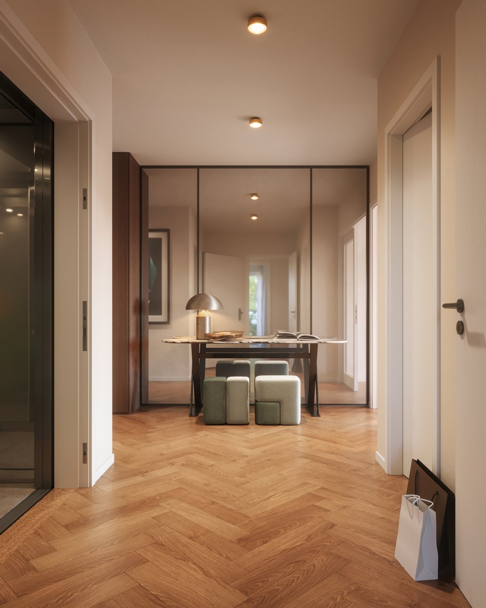Diese großzügige 4-Zimmer-Wohnung im Erdgeschoss bietet auf ca. 183 m² Wohnfläche ein hochwertiges, durchdachtes Raumkonzept. Das offene Entree empfängt Sie großzügig und ermöglicht direkten Zugang über den Aufzug – bequem von der Tiefgarage bis in die Wohnung – sowie über die klassische Hauseingangstür. Eine praktische Gäste-Toilette ist direkt integriert.