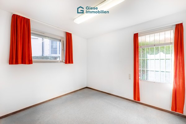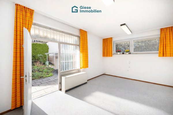 Das Gebäude erstreckt sich über vier Ebenen. Im Souterrain befinden sich ein Gästezimmer, ein Badezimmer, eine Küche sowie eine großzügige Fläche mit direktem Zugang zum Garten. Durch die großen Fenster und den Blick ins Grüne wirkt dieser Bereich überraschend hell und bietet optimale Voraussetzungen für zusätzlichen Wohnraum.
