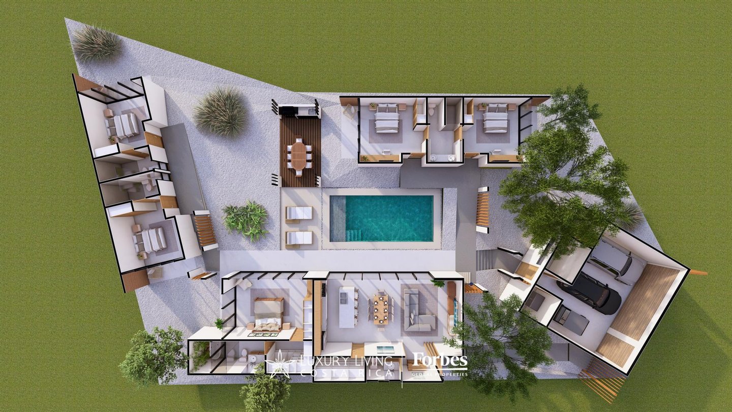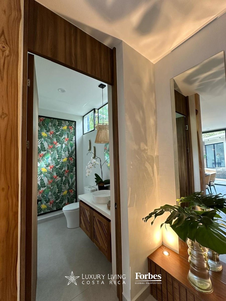"Olas y Bosque" bietet eine nahtlose Integration von Innen- und Außenbereichen, die so gestaltet sind, dass sie das tropische Klima und die üppigen Wälder Costa Ricas umarmen. Das Anwesen erstreckt sich über ein 869 m² großes Grundstück, das sorgfältig gestaltet wurde, um die lokalen Bäume und Pflanzen zu erhalten und zu pflegen, sodass Sie eine tiefe Verbindung mit der Umwelt erleben können. Die 456,50 m² Wohnfläche sind so gestaltet, dass jeder Raum die Essenz seiner Umgebung einfängt. Große Fenster und offene Räume lassen natürliches Licht herein, um die Räume zu beleuchten, während die Außenbereiche, einschließlich eines privaten Pools, den perfekten Rahmen zum Entspannen unter der Sonne Costa Ricas bieten.
