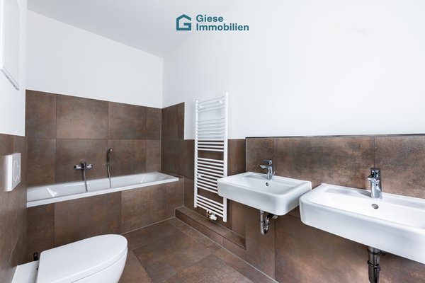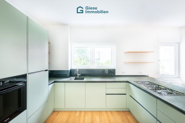 Die maßgefertigte Einbauküche überzeugt durch hochwertige Materialien, moderne Geräte und ein durchdachtes Design, das Kochen zum Vergnügen macht. Sie fügt sich nahtlos in den Wohnbereich ein und wird schnell zum kommunikativen Mittelpunkt der Wohnung. Das stilvoll gestaltete Badezimmer mit zwei Waschtischen, Badewanne und großformatigen Fliesen bietet einen eleganten Rückzugsort, der Komfort und Wohlfühlatmosphäre perfekt vereint.