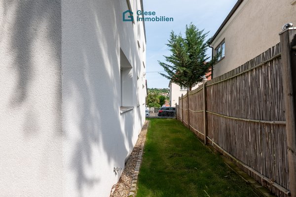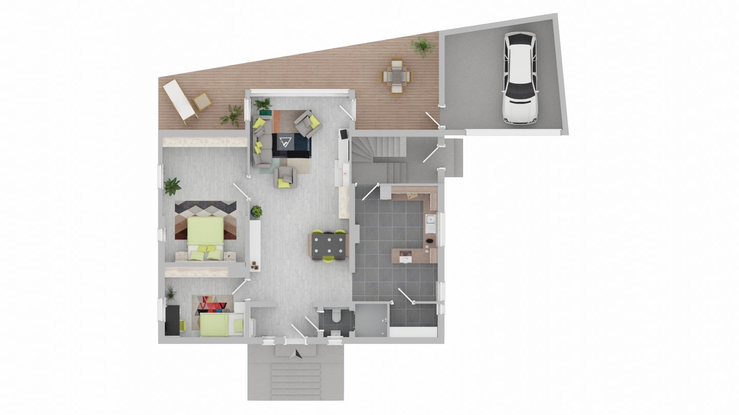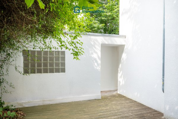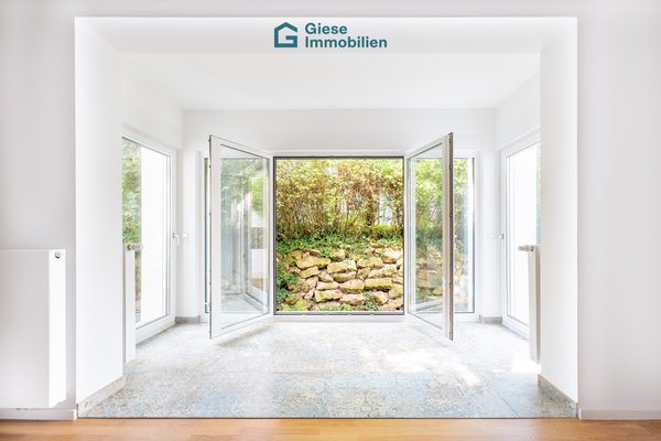Ein besonderes Highlight ist die großzügige Terrasse mit direktem Zugang ins Grüne. Sie erweitert den Wohnraum nach draußen und lädt dazu ein, entspannte Stunden an der frischen Luft zu verbringen. Ob ein ruhiger Start in den Tag mit einer Tasse Kaffee oder ein entspannter Abend in natürlicher Umgebung, dieser Außenbereich bietet einen hohen Erholungswert und macht das Wohnen besonders attraktiv.