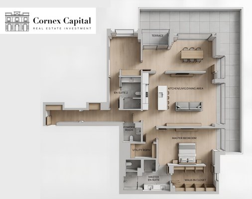 The heart of the property is a large, bright living-dining room with an integrated kitchen, conceived as an open and fluid space that connects to a pleasant loggia-style terrace, creating a natural transition between indoors and outdoors. The sleeping area features two generously sized bedrooms, designed as true private suites, as well as additional spaces that can be adapted to different lifestyles. The apartment is presented in impeccable condition, practically brand new, with top-of-the-line materials and workmanship that meets the highest international standards.