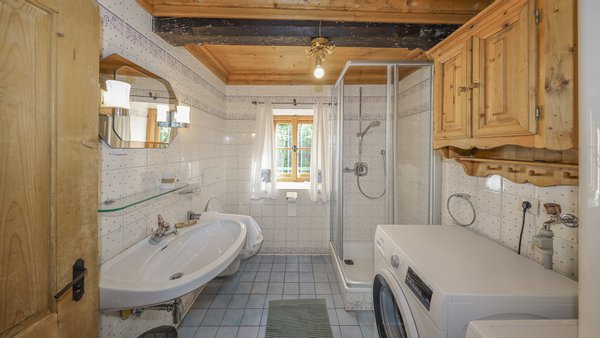 Man betritt das Haus und kommt in einen Flur, von dem alle Räume des Erdgeschosses erreichbar sind. Rechts geht es in die bäuerliche Küche mit funktionierenden Bauernofen, diversen Schränken, Kühlschrank und einem kleinen Essbereich. Links geht es in die Stube, mit großem Esstisch, Eckbank und Kachelofen. Sowie einer gemütlichen Sitzecke im hinteren Bereich. Hinter dem Stiegen Aufgang in den 1. Stock befindet sich ein großes Badezimmer mit Dusche, WC, Waschmaschine und Trockner.