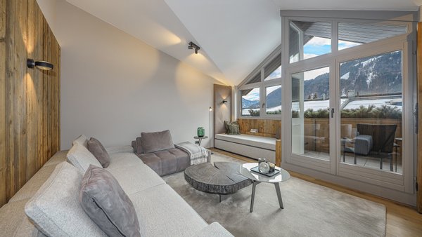 Die hier angebotene Luxus-Dachgeschoss-Suite befindet sich in Ruhelage am Fuße der begehrten Bichlalm, unmittelbar am Golfplatz Schloss Kaps.
