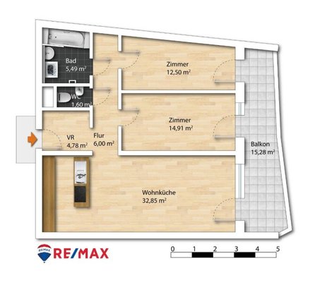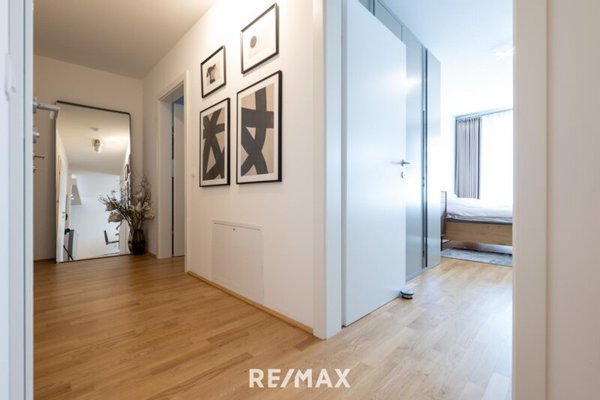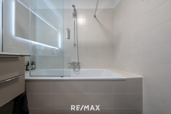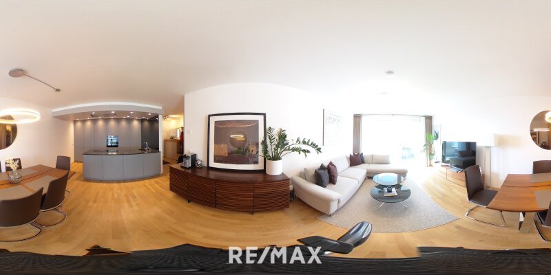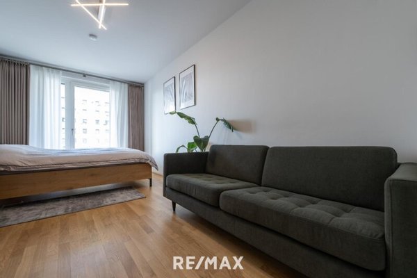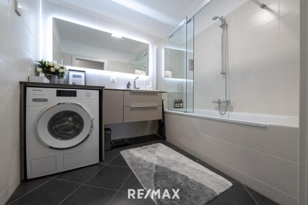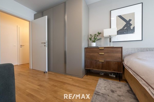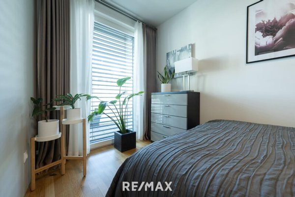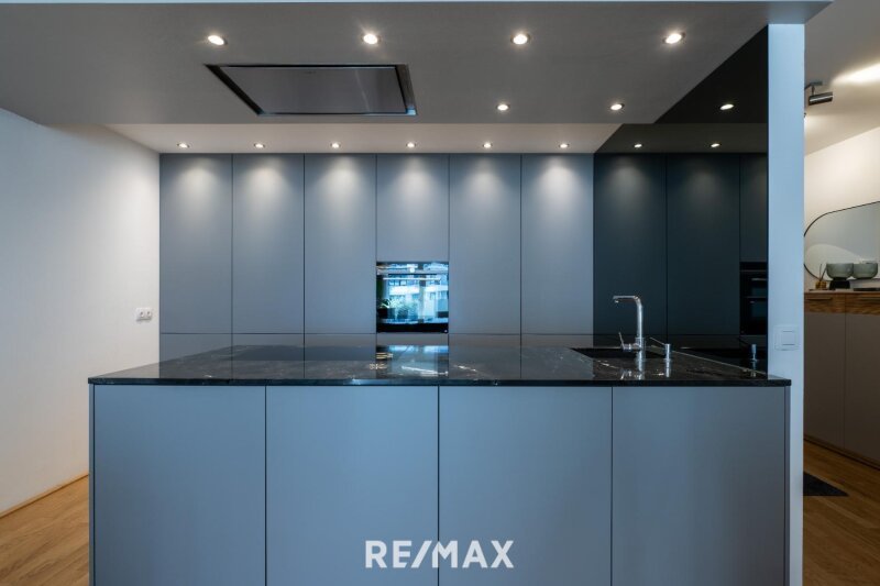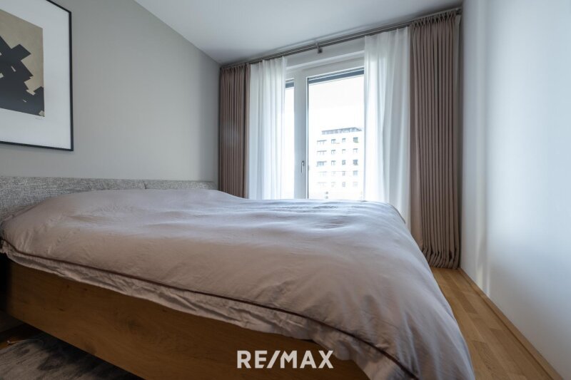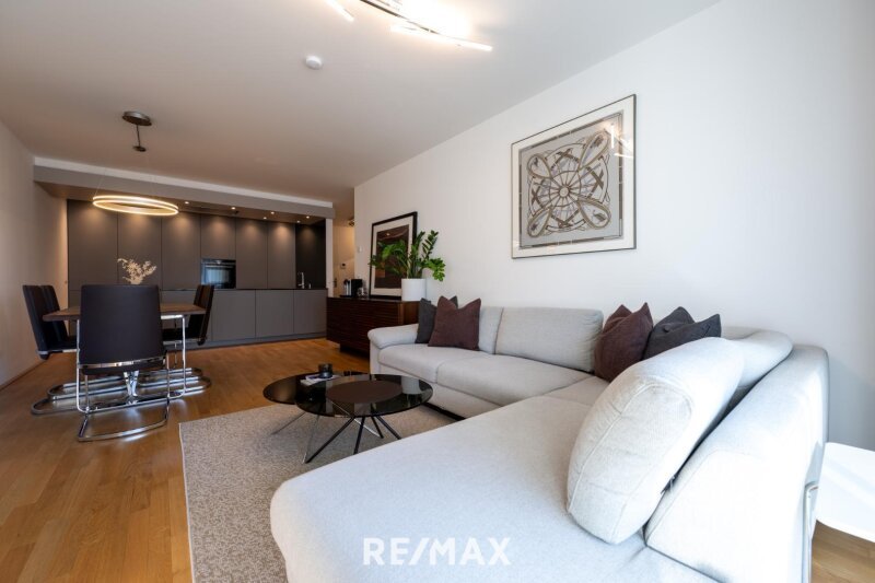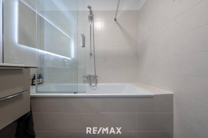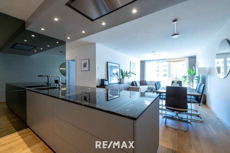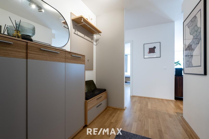 Die Wohnung besteht aus einer Wohnküche, 2 Schlafzimmern, einem Bad mit Badewanne und einer separaten Toilette. Alle Zimmer haben Zugang zum großen westseitigen Balkon. Für besten Sonnenschutz sind alle Fenster mit elektrischen Raffstores ausgestattet. Eine hochwertige Küche mit grifflosen Fronten und einer Steinarbeitsplatte ist wie neu, und im Badezimmer finden Sie Einbaumöbel, eine schiebbare Duschwand und einen Spiegel mit indirekter Beleuchtung. Die gesamte Einrichtung ist sehr stilvoll aus-gesucht, und das Beste: ein Großteil davon bleibt auch in der Wohnung!