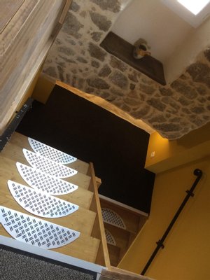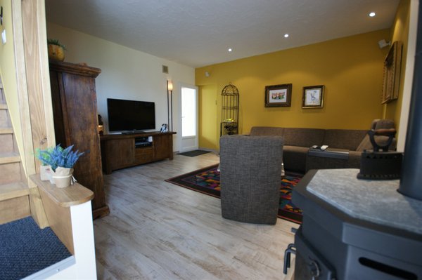 Die zweite Etage beinhaltet ein weiteres bequemes Wohn-/Küchenzimmer, ein Mezzanin-Schlafzimmer, erreichbar über eine Holztreppe, und ein Badezimmer mit WC.
