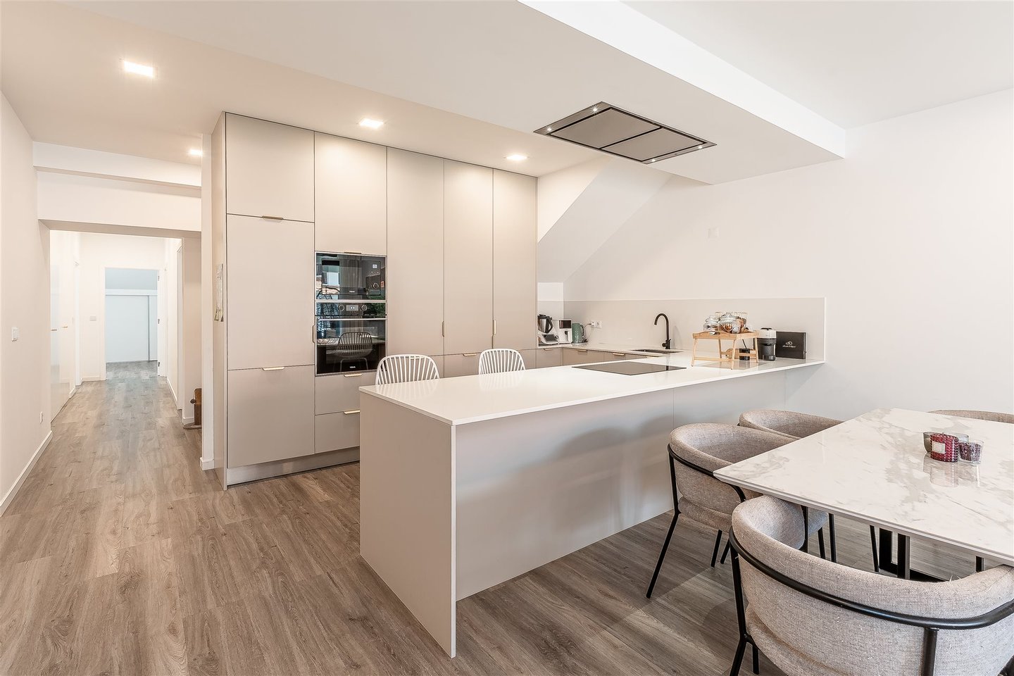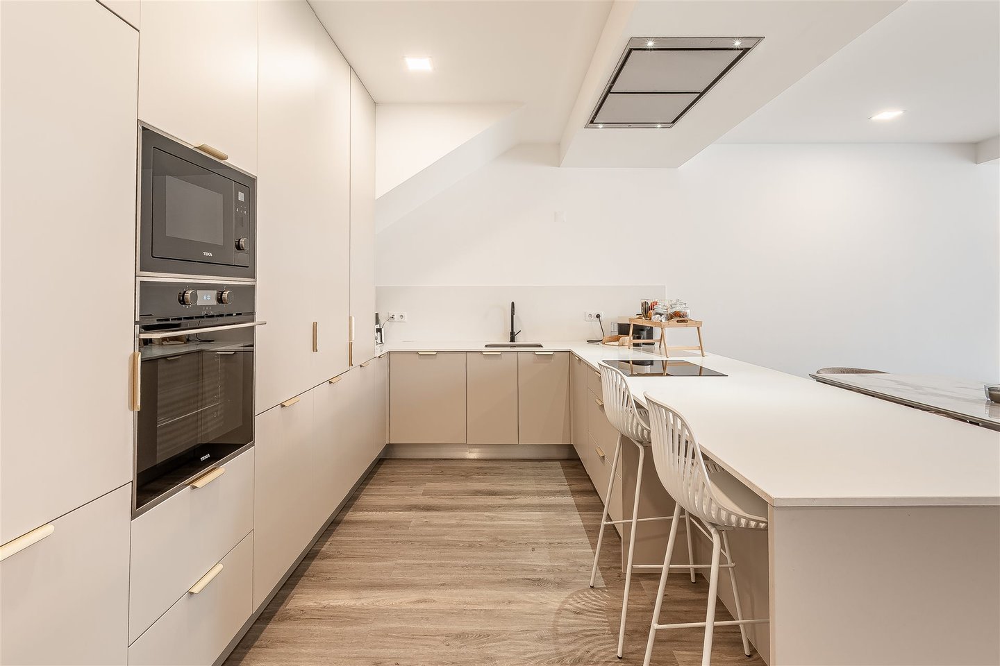 Die Küche ist mit modernen Geräten ausgestattet und verfügt über einen integrierten Essbereich.