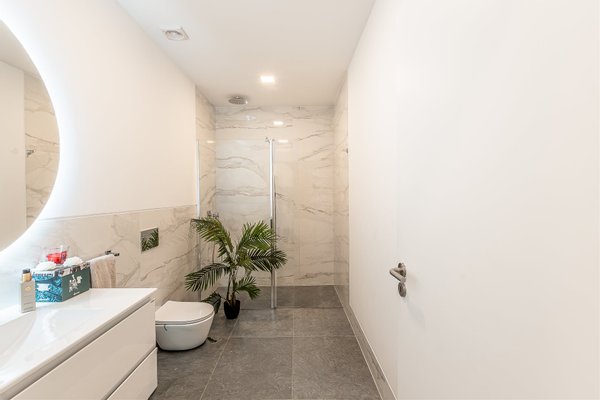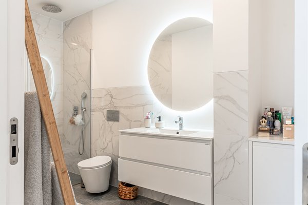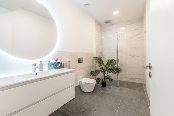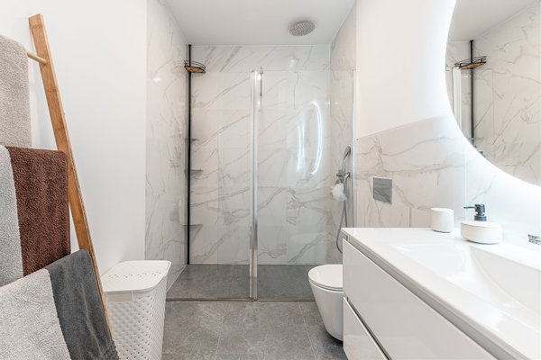 Die Wohnung verfügt außerdem über zwei zusätzliche Badezimmer, eines zur Unterstützung des sozialen Bereichs und eines für die Schlafzimmer. Zwei großzügige Balkone vervollständigen das Objekt und bieten weitreichende Blicke auf die Umgebung, mit Blick auf die Berglandschaft und Gartenbereiche.