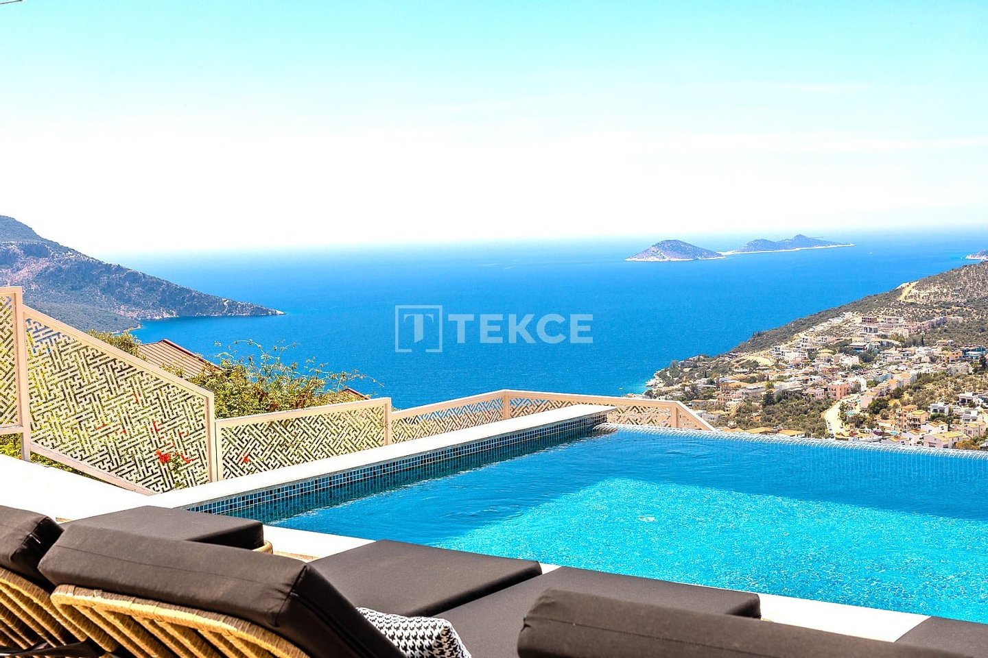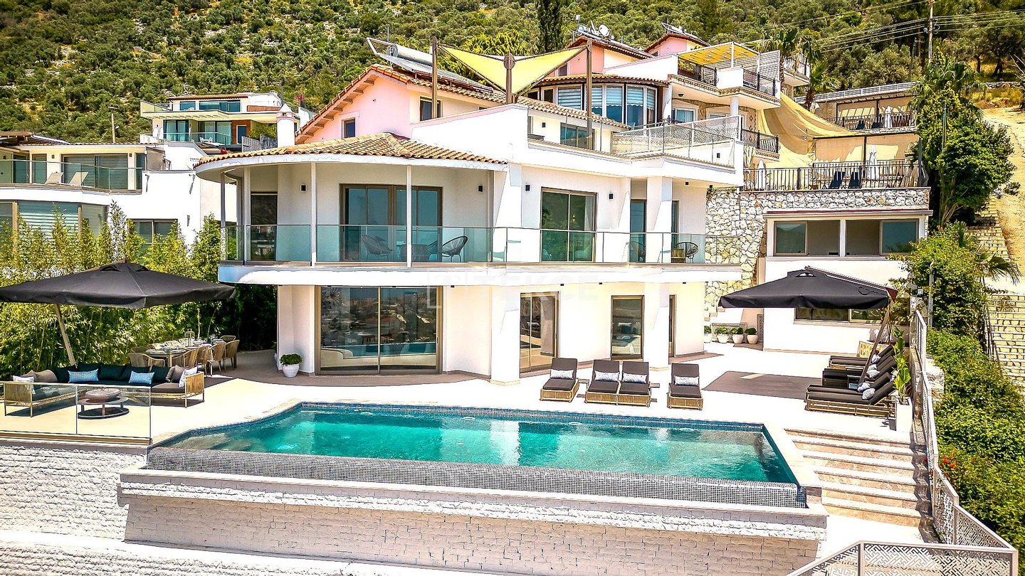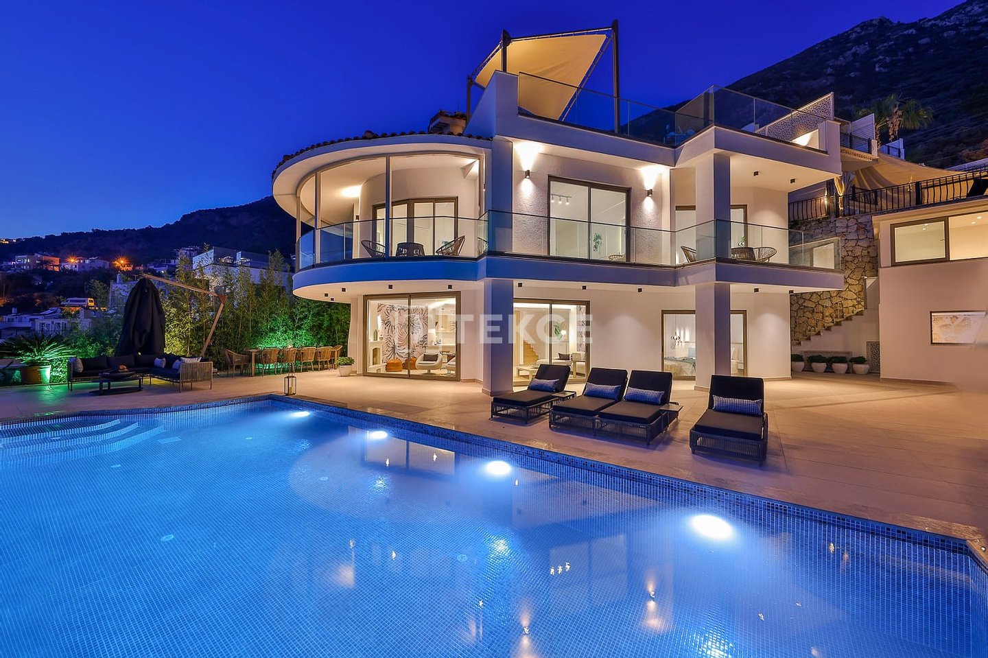 Villa mit Panoramablick auf das Meer und Außen-Innenpools in der Nähe des Zentrums von Kalkan & 13 Kızıltaş, eine der prestigeträchtigsten Gegenden von Kalkan, ist ein exklusiver Wohnort, der aufgrund seiner Nähe zum Zentrum und seiner erhöhten Lage