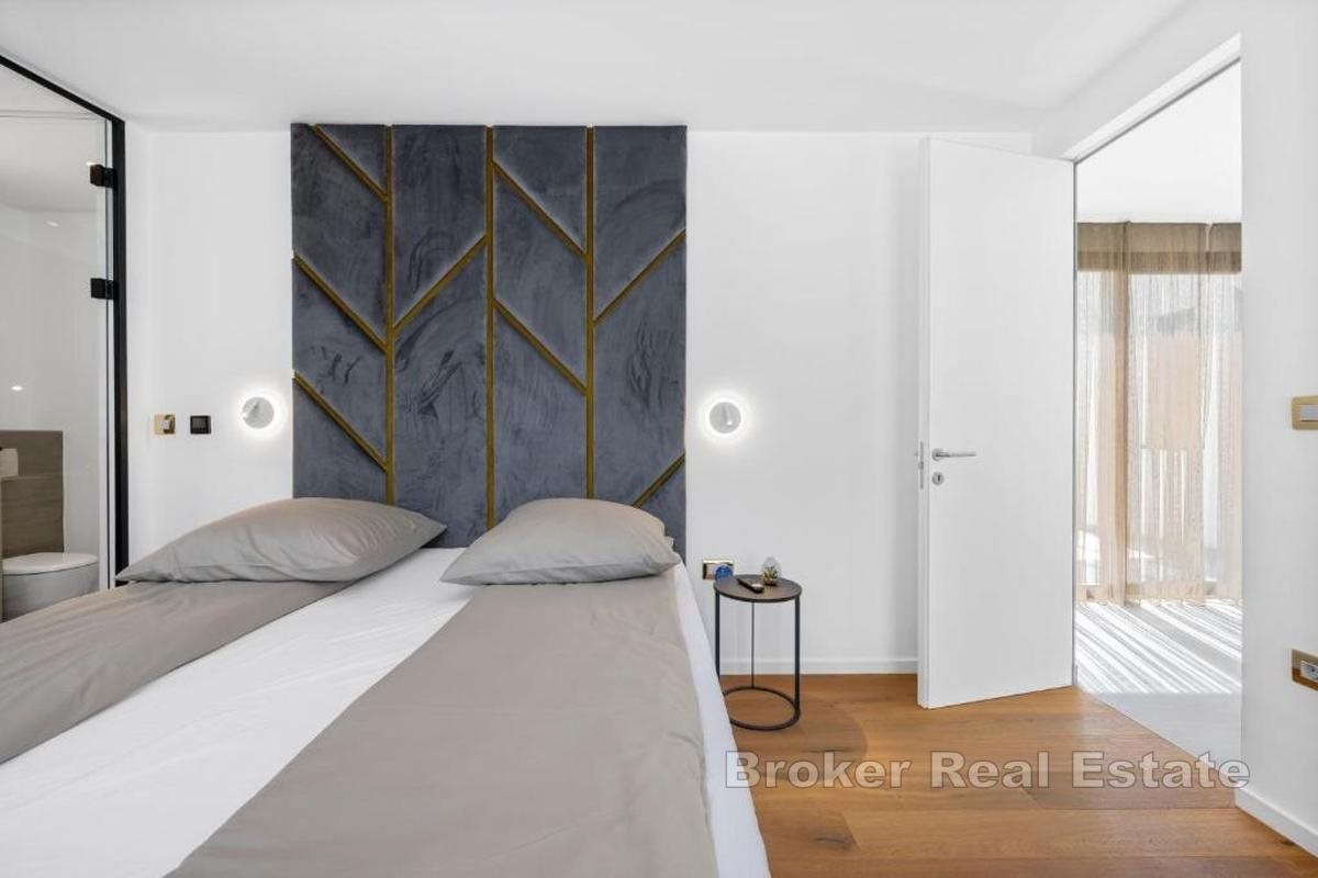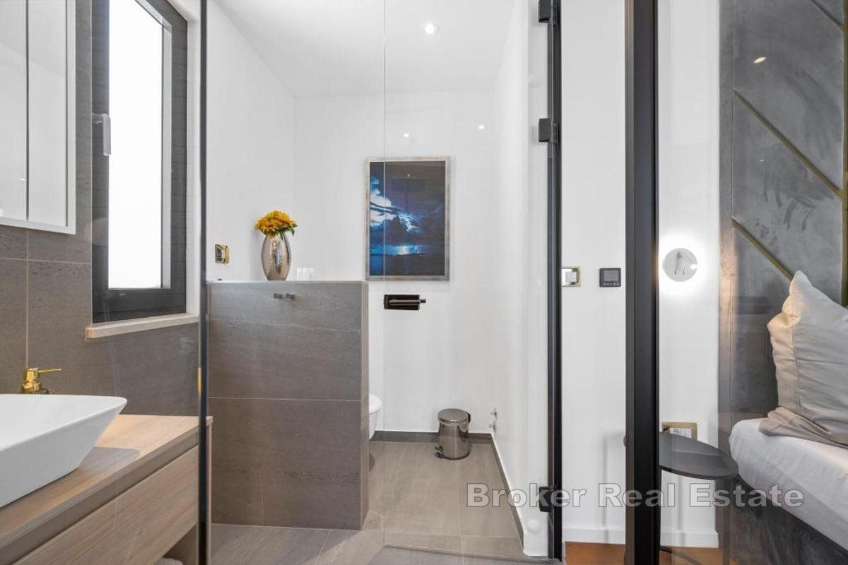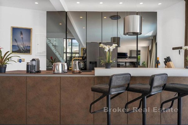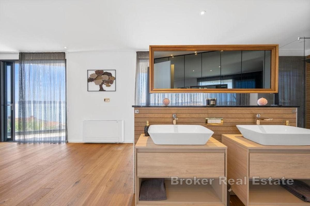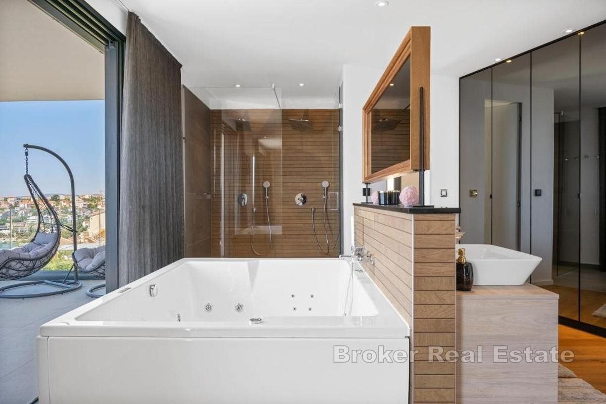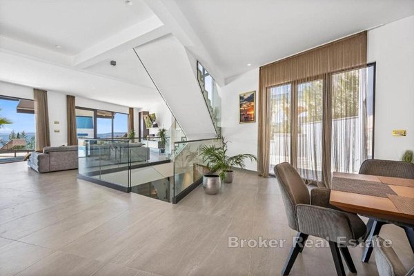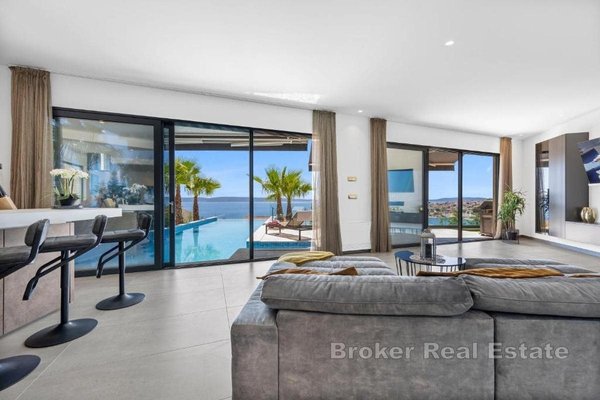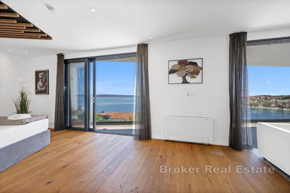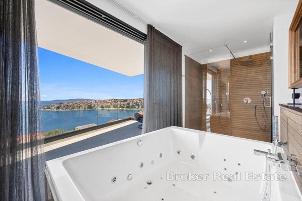 Eine exklusive Luxusvilla mit atemberaubendem, ungehindertem Meerblick befindet sich in einer erstklassigen Lage auf der Insel Čiovo und stellt die perfekte Kombination aus zeitgenössischer Architektur, hochwertiger Ausstattung und absoluter