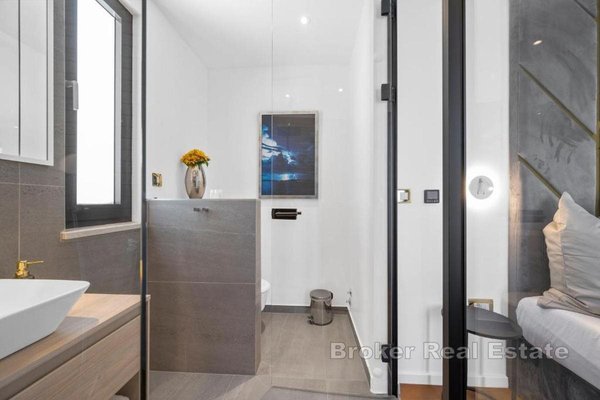 Im oberen Stockwerk befindet sich der Schlafbereich der Villa mit einem Flur, der zu drei luxuriösen Schlafzimmern führt, jedes mit eigenem Badezimmer und Terrassen. Das luxuriöse Hauptschlafzimmer, das sich die gesamte Südhälfte des Obergeschosses erstreckt, besticht durch einen offenen Meerblick und eine Massagebadewanne, die sich im Zentrum des Raumes befindet und ein Gefühl von exklusivem Hotel-Luxus vermittelt.