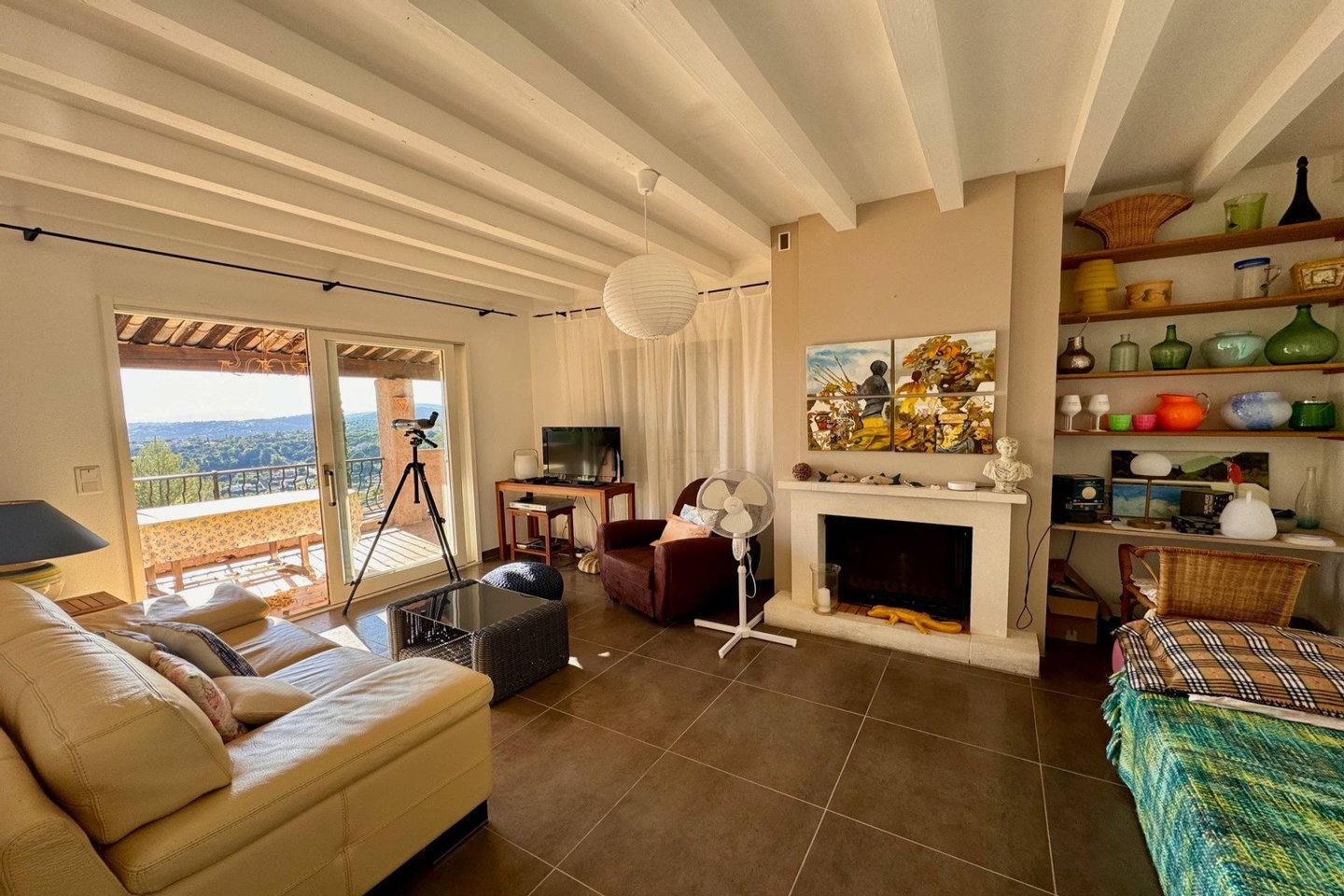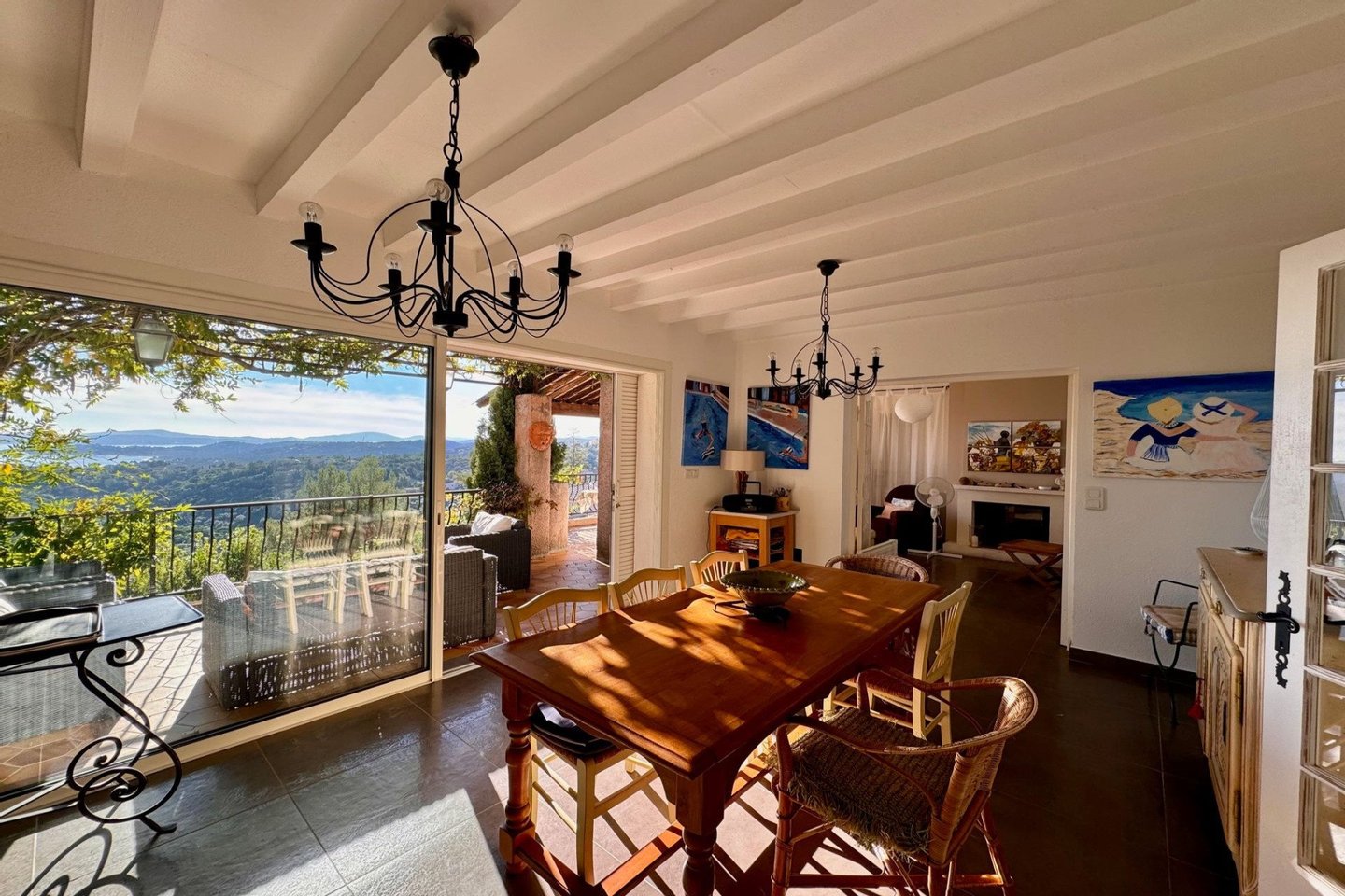 Les Issambres, wunderschöner Panoramameerblick auf die Bucht von Saint-Tropez für diese charmante Villa, die in einer grünen Oase eingebettet ist. Sie umfasst im Erdgeschoss einen Flur, der zu einem Wohnzimmer/Eßzimmer mit offener Küche führt, das