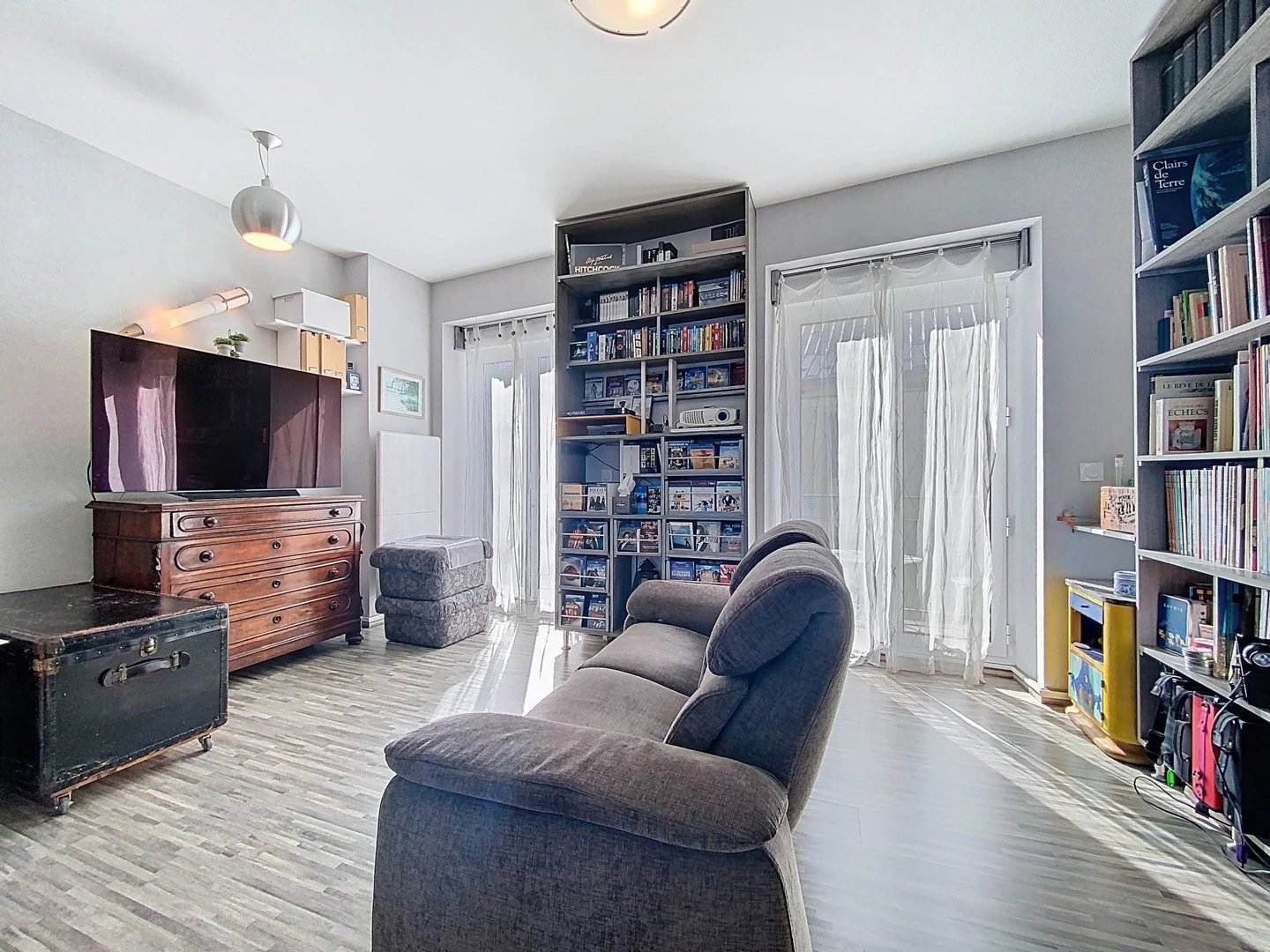 Durch die großzügigen Fenster strömt viel Licht hinein, was eine warme und einladende Atmosphäre im Laufe des Tages schafft.