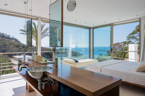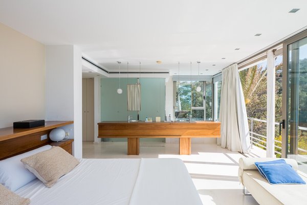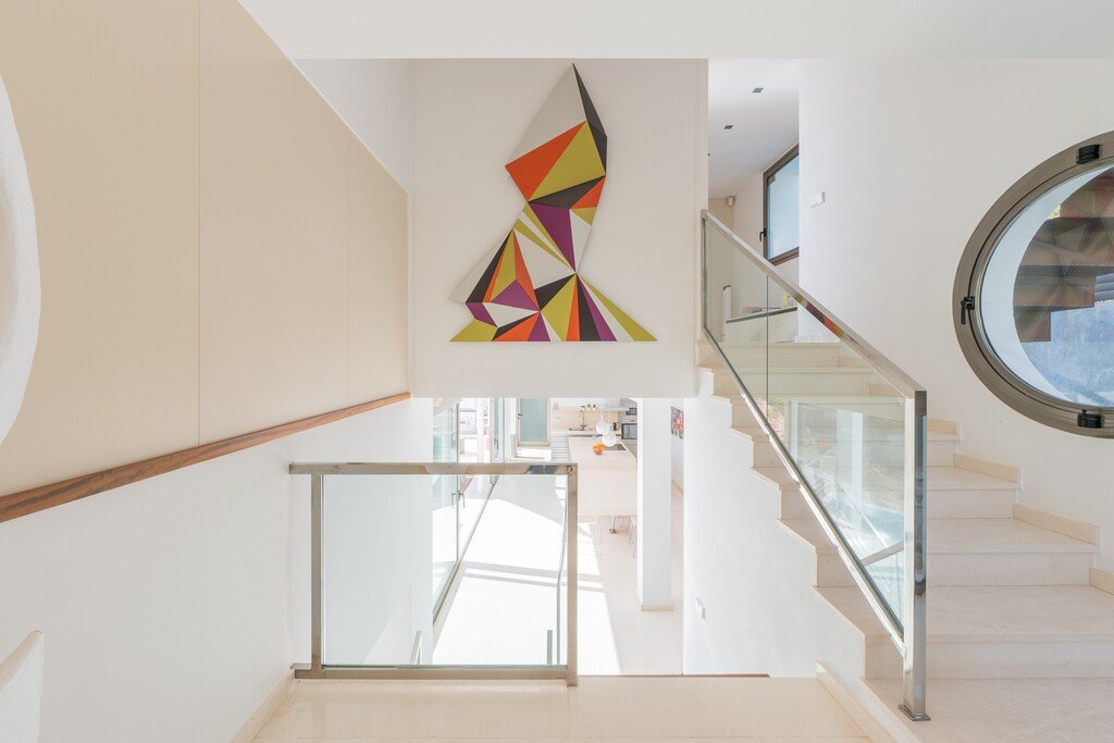 Im Inneren öffnet sich die geräumige, voll ausgestattete Küche zu einem Außen-Essbereich, ideal für Mahlzeiten im mediterranen Freien. Alle Schlafzimmer befinden sich im Obergeschoss, darunter eine Master-Suite mit beeindruckendem Meerblick, privaten Badezimmern, Einbauschränken und direktem Zugang nach draußen.