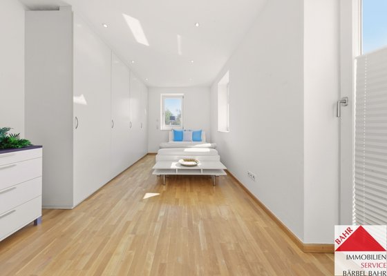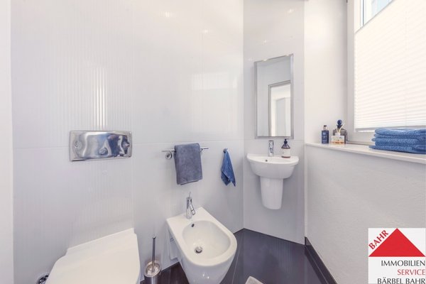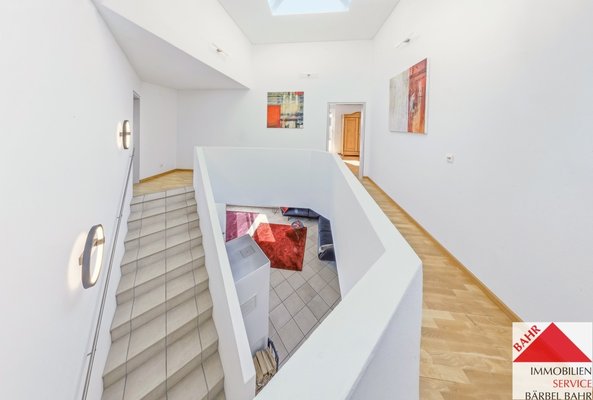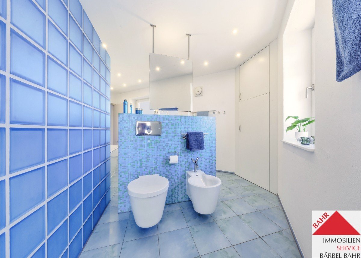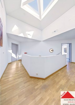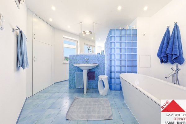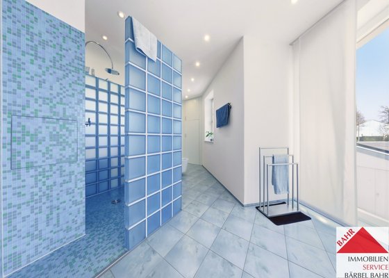 Im Obergeschoss 3 Zimmer, herrliches Tageslicht-Bad mit allem Komfort, freistehender Wanne, Wäscheabwurf, Einbauschrank. Aus diesem Bad kann man bei Bedarf auch 2 Bäder machen, in dem man es in der Mitte teilt.