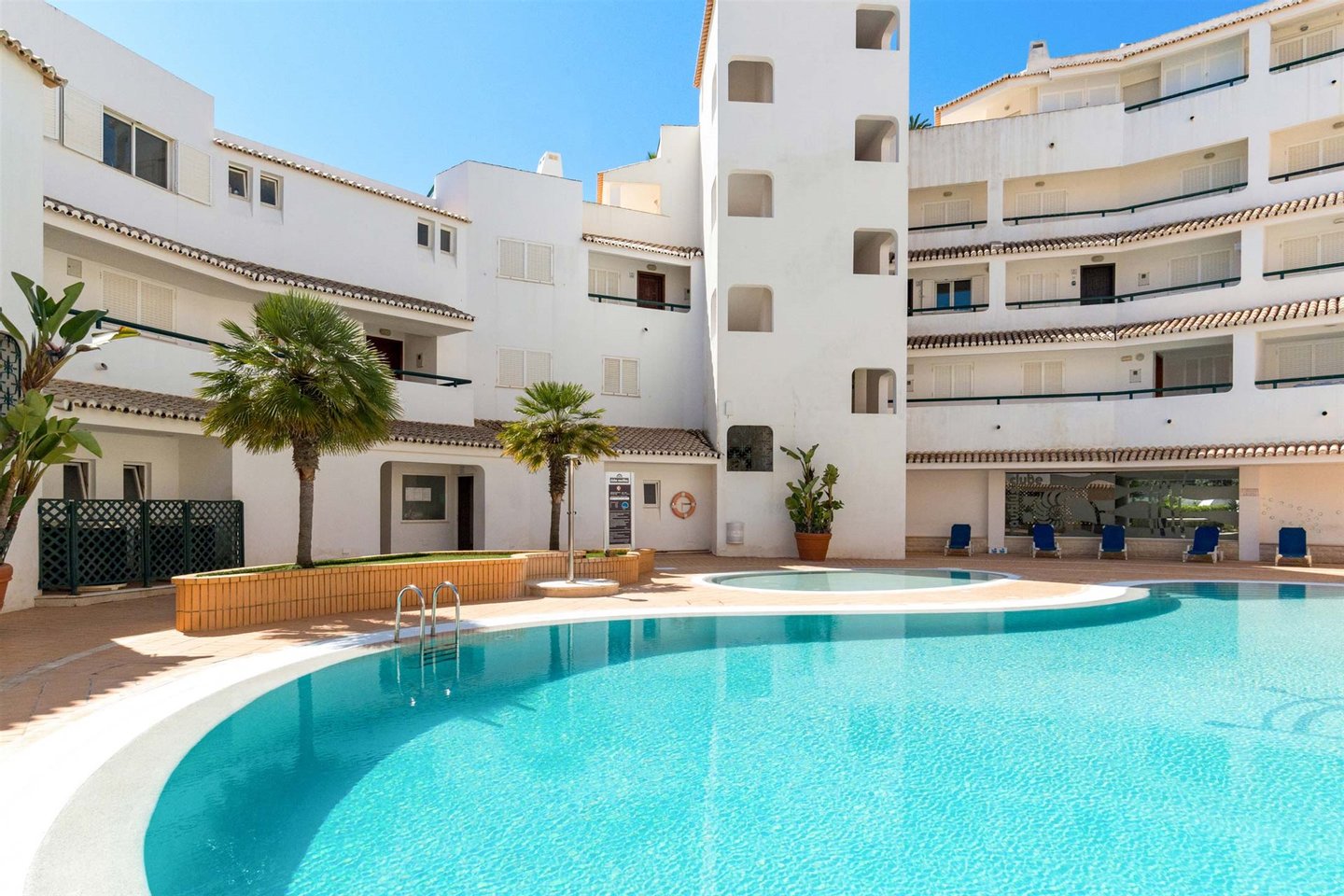 Der Gemeinschaftspoolbereich bietet ausreichend Platz zum Sonnenbaden und Entspannen und schafft eine echte Resort-Atmosphäre für Bewohner und Gäste. Ein Aufzug ermöglicht direkten Zugang zur Garage, in der zwei private Stellplätze enthalten sind. Zu den weiteren Merkmalen gehören Klimaanlage und Jalousien, die ganzjährig Komfort und Sicherheit gewährleisten.