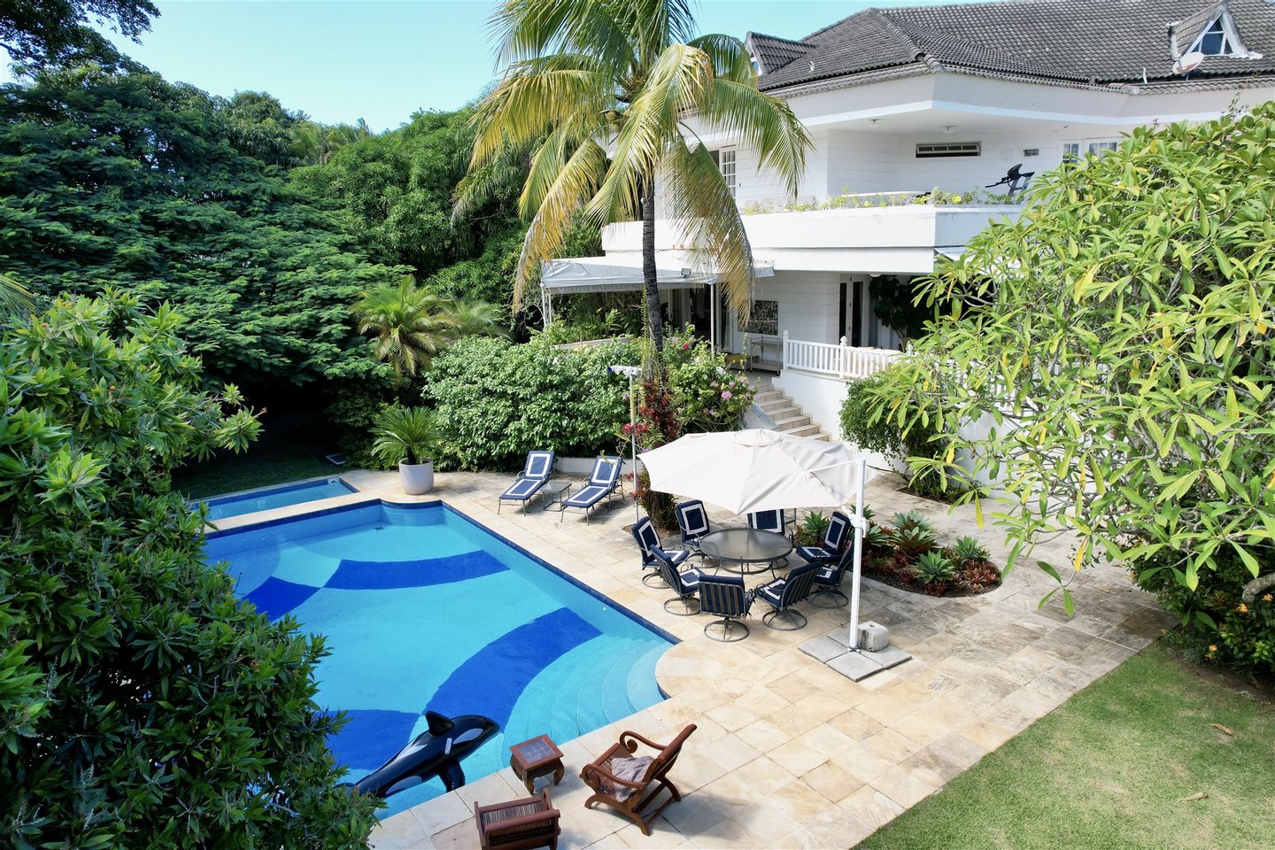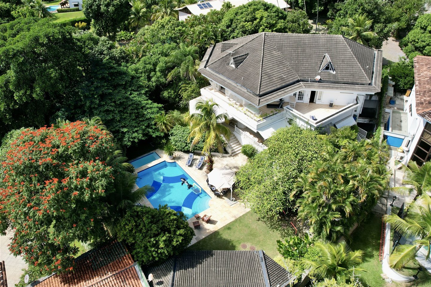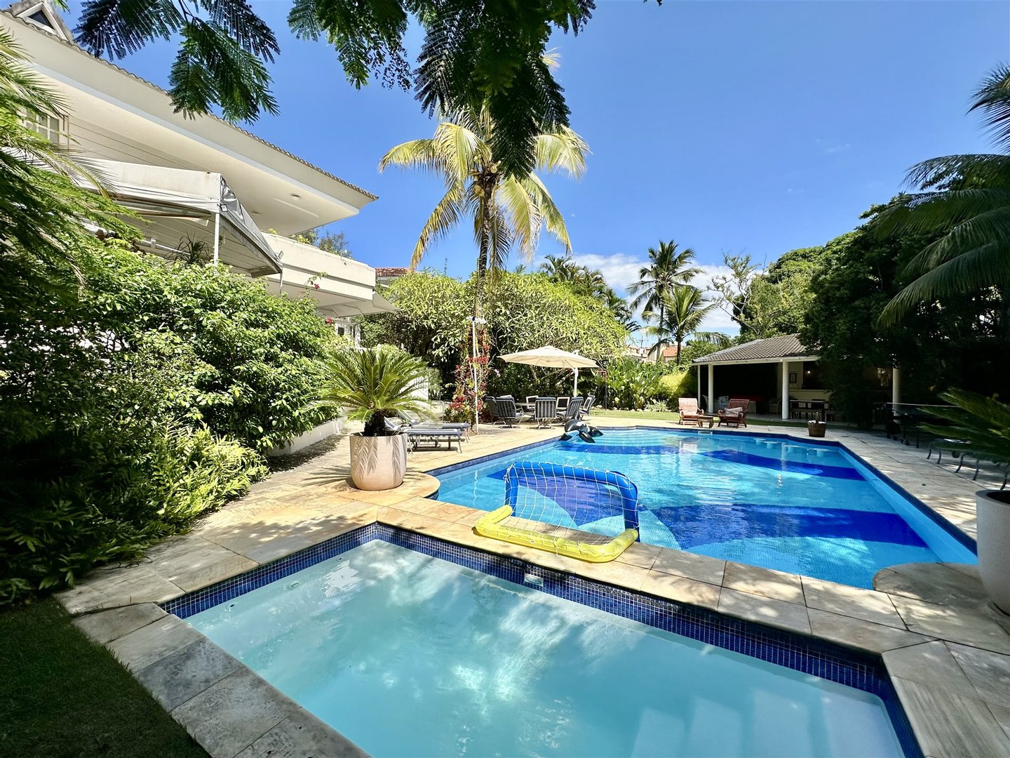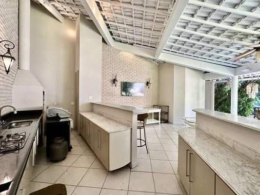 Der Außenbereich ist auf Freizeit und Naturverbundenheit ausgelegt und verfügt über Erwachsenen- und Kinderbecken, von einem Garten umgeben, eine Meditations-Ecke mit einem Wasserbrunnen, einen Spielbereich und ein Graspfeld. Die Veranda verbindet sich mit der Küche über einen Frühstücksbereich, was die Integration erhöht. Der Gourmetbereich umfasst eine Bar, Grill und eine Neben-Küche. Die Immobilie bietet außerdem einen Hundezwinger, Waschküche und Servicebereich.