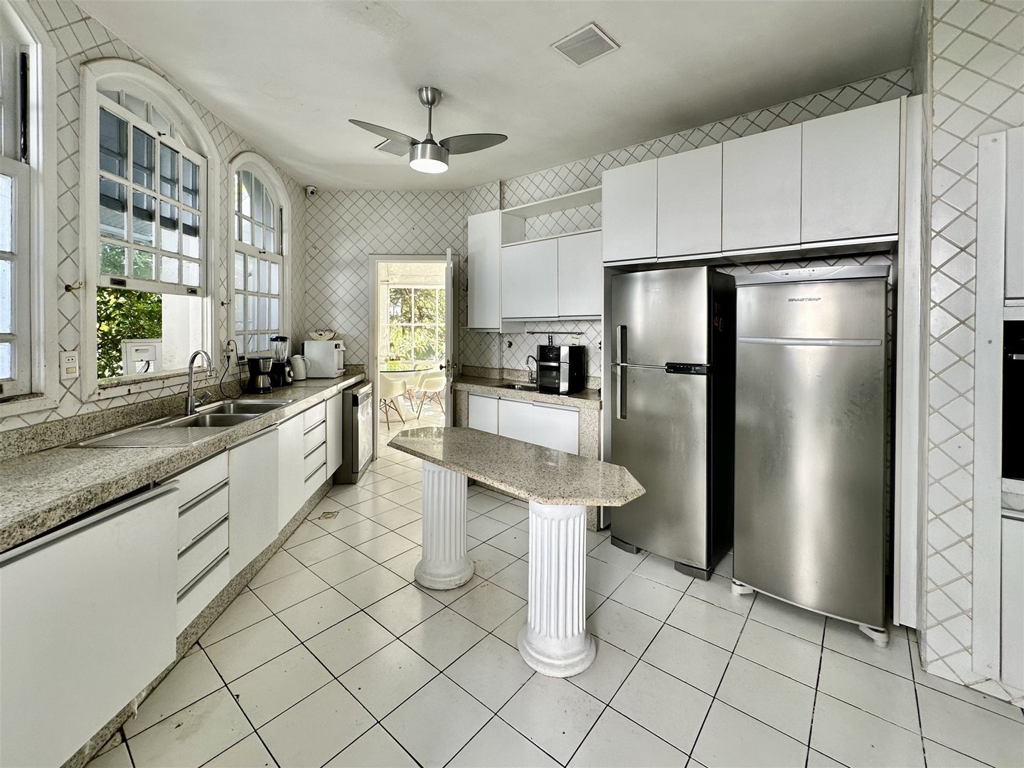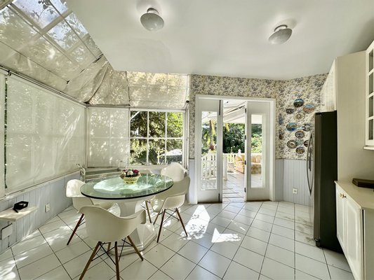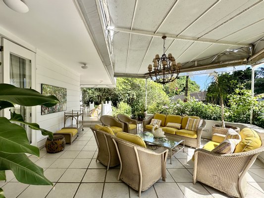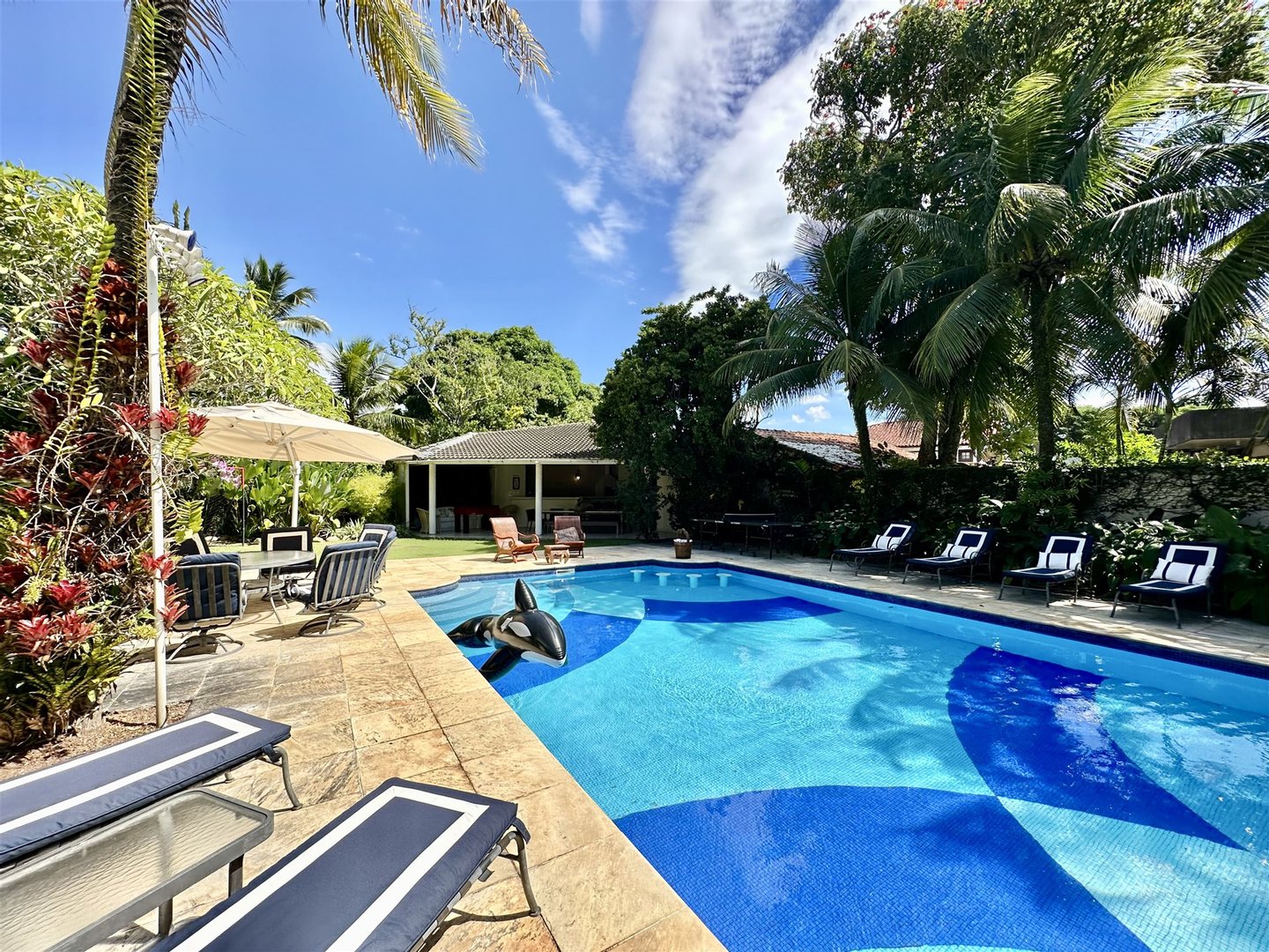 Der Außenbereich ist auf Freizeit und Naturverbundenheit ausgelegt und verfügt über Erwachsenen- und Kinderbecken, von einem Garten umgeben, eine Meditations-Ecke mit einem Wasserbrunnen, einen Spielbereich und ein Graspfeld. Die Veranda verbindet sich mit der Küche über einen Frühstücksbereich, was die Integration erhöht. Der Gourmetbereich umfasst eine Bar, Grill und eine Neben-Küche. Die Immobilie bietet außerdem einen Hundezwinger, Waschküche und Servicebereich.