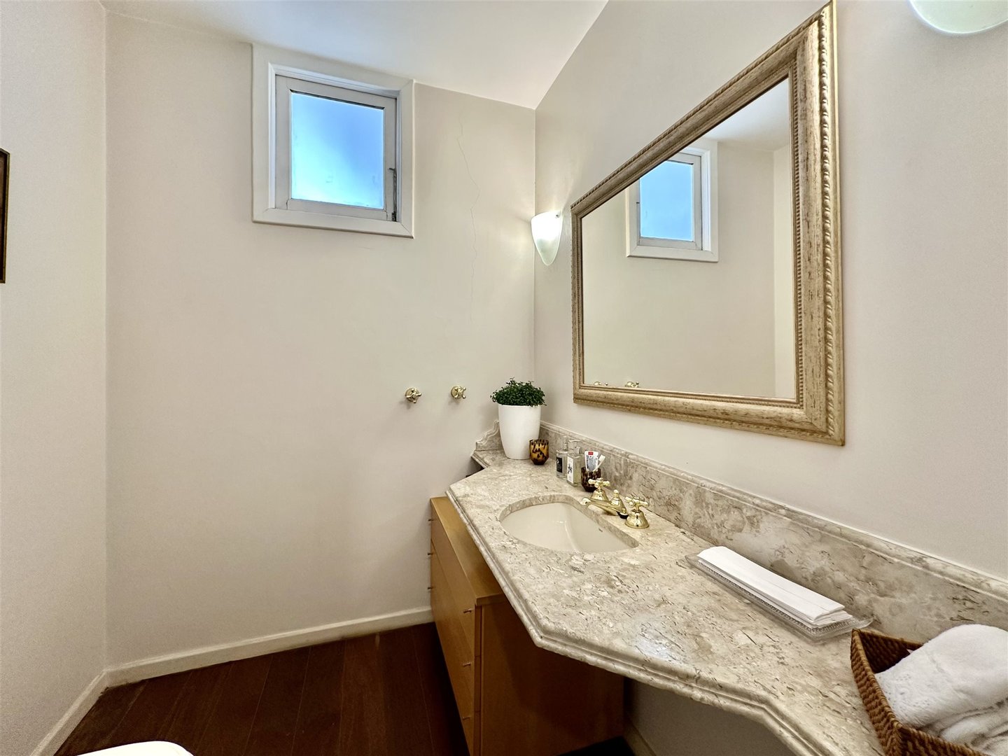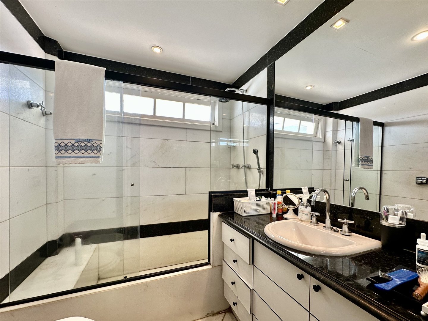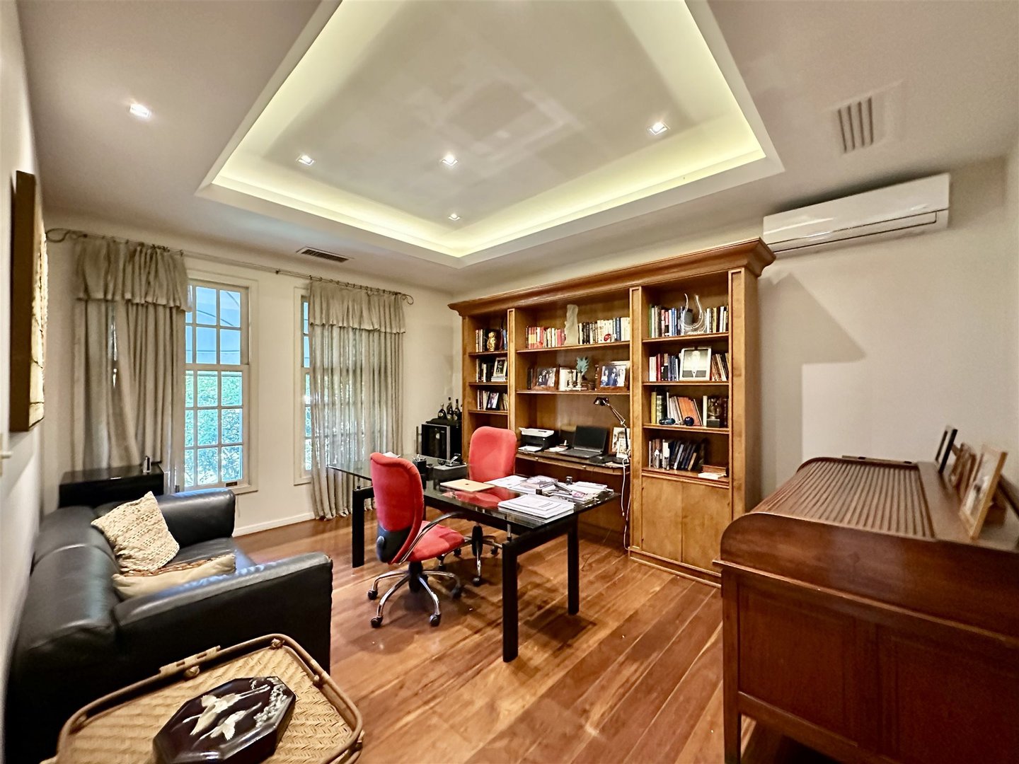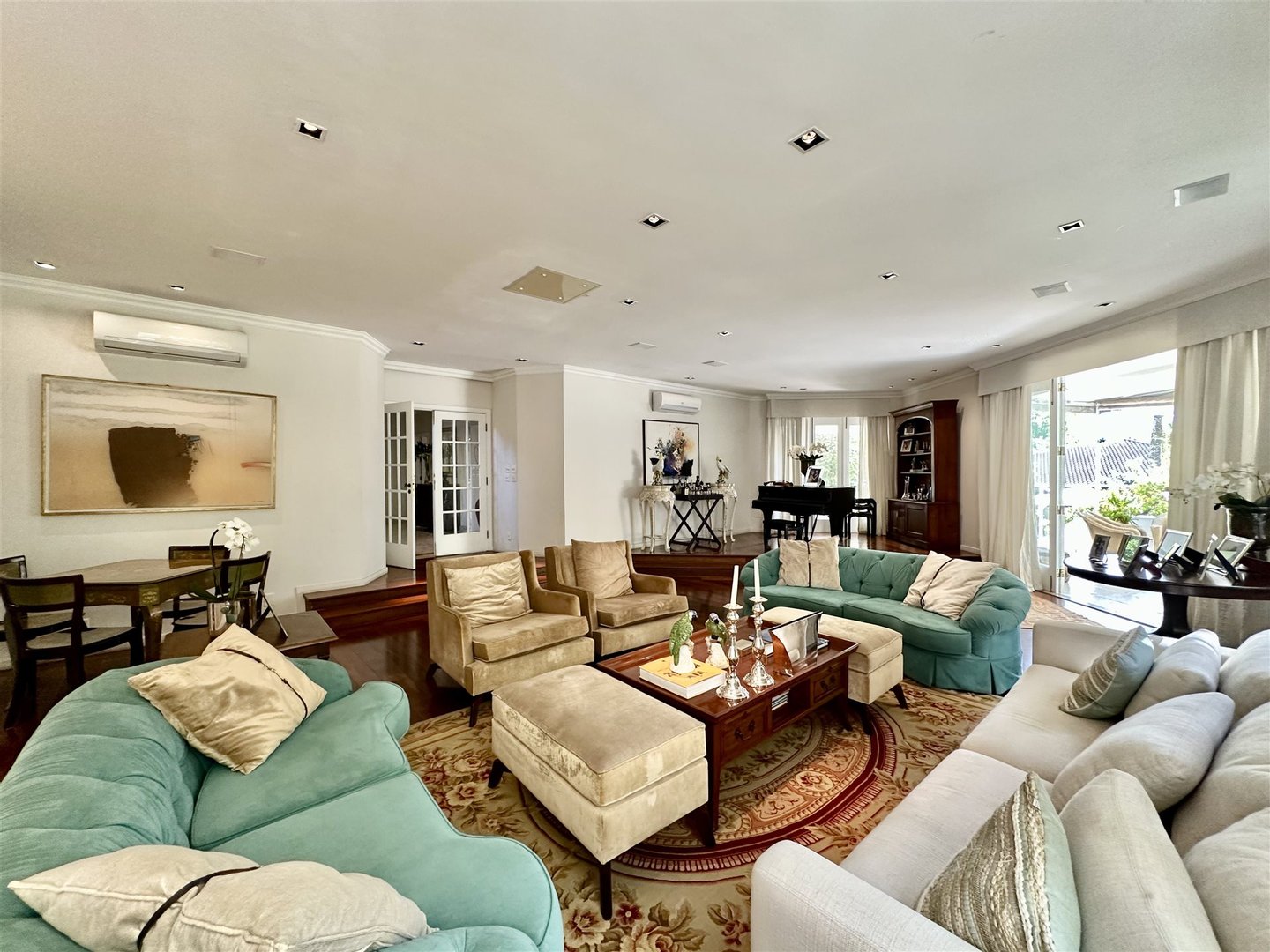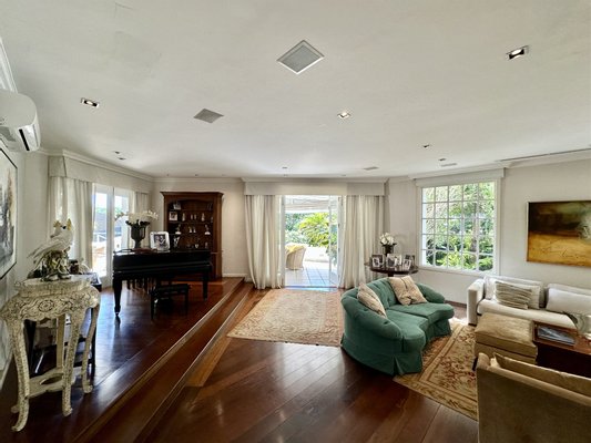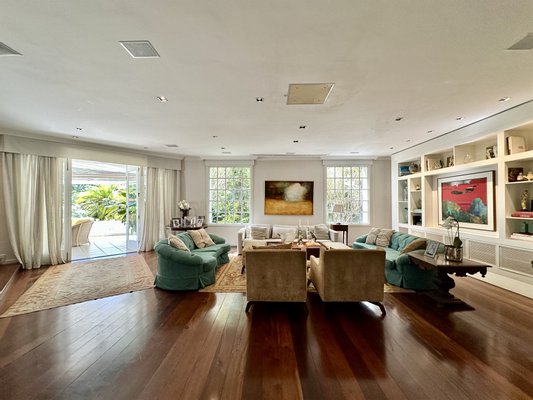Hochwertiges Haus in einer geschlossenen Anlage mit 24-Stunden-Sicherheit, das Privatsphäre, Komfort und komplette Infrastruktur in einer exklusiven Umgebung bietet. Der Eingang zeigt einen Garten und einen Steinweg, der zu einer doppelten Haustür mit glass Portikus führt und in einen zweistöckigen gesellschaftsbereich mit Travertinboden öffnet. Der Hauptwohnteil, mit kreisförmigem Grundriss und Holzböden, umfasst Wohnzimmer, Esszimmer, Lounge mit Klavier und Bildschirm sowie ein Gästebad und eine Suite.