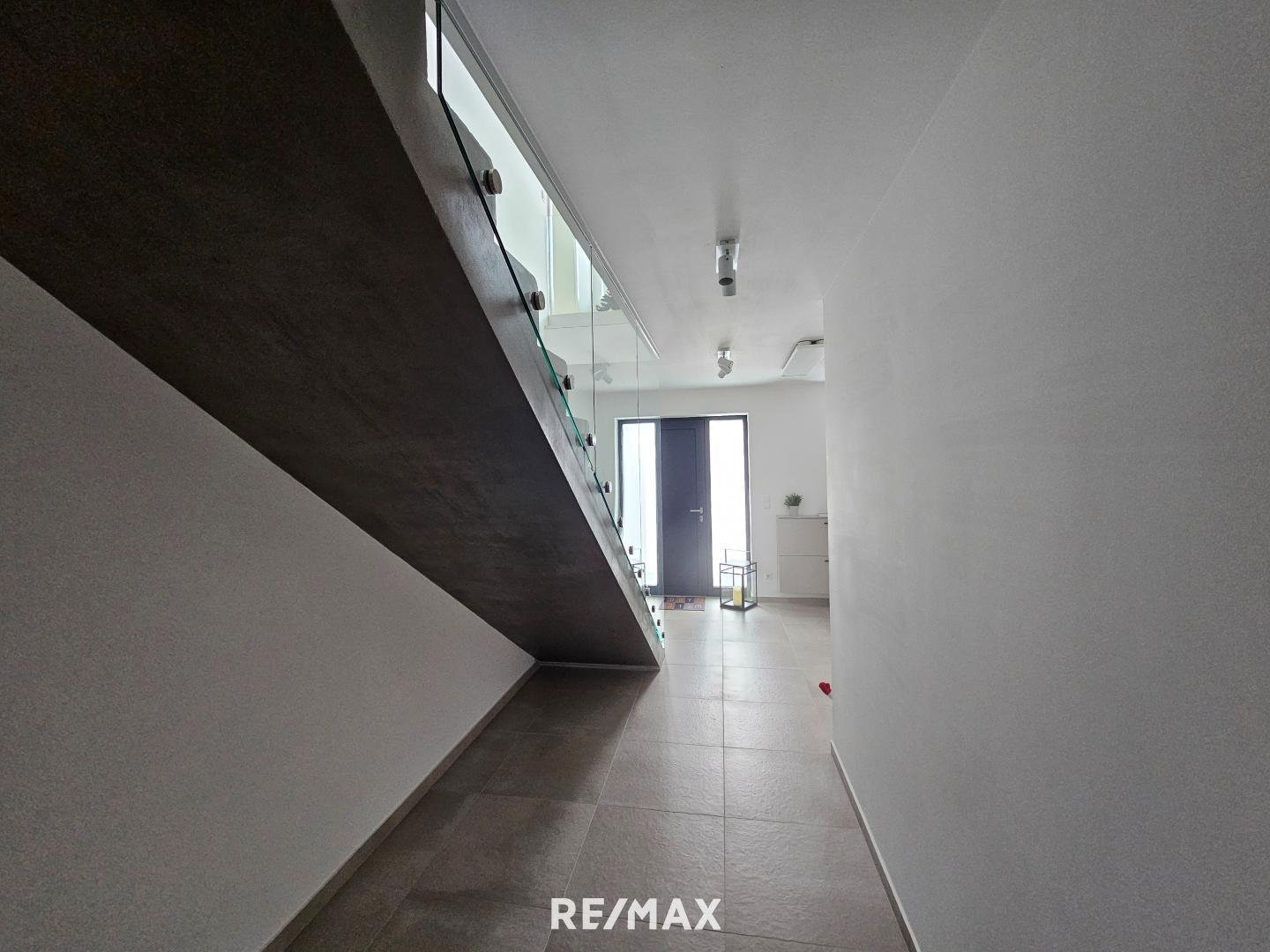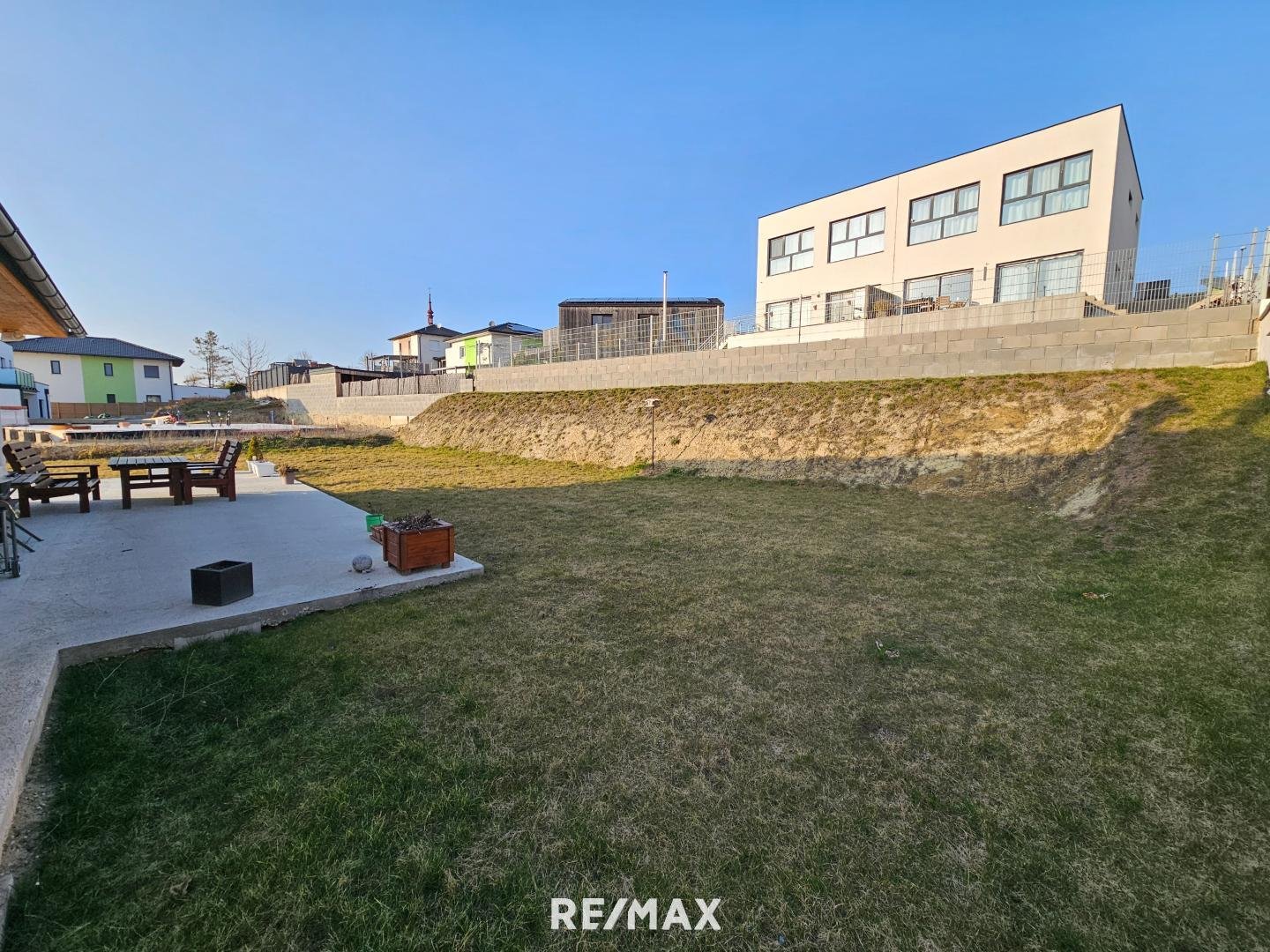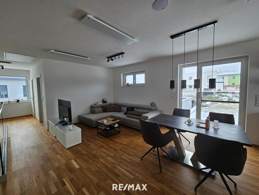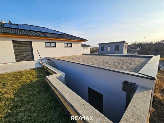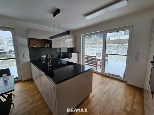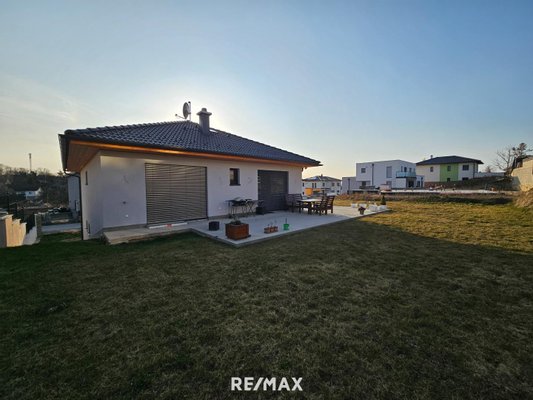 Durch die Glasfronten sieht man in den Garten - dieser kann noch schön angelegt werden. Eine Terrasse lädt zum gemütlichen Verweilen ein. Vom Garten kommt man über Stiegen wiederum in die Garage - diese ist auch direkt mit dem Wohnhaus verbunden.