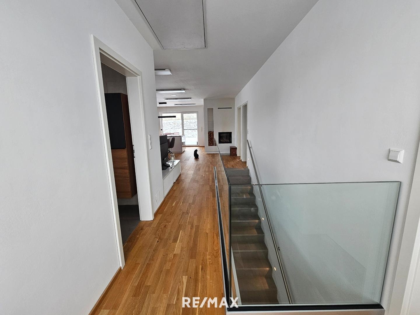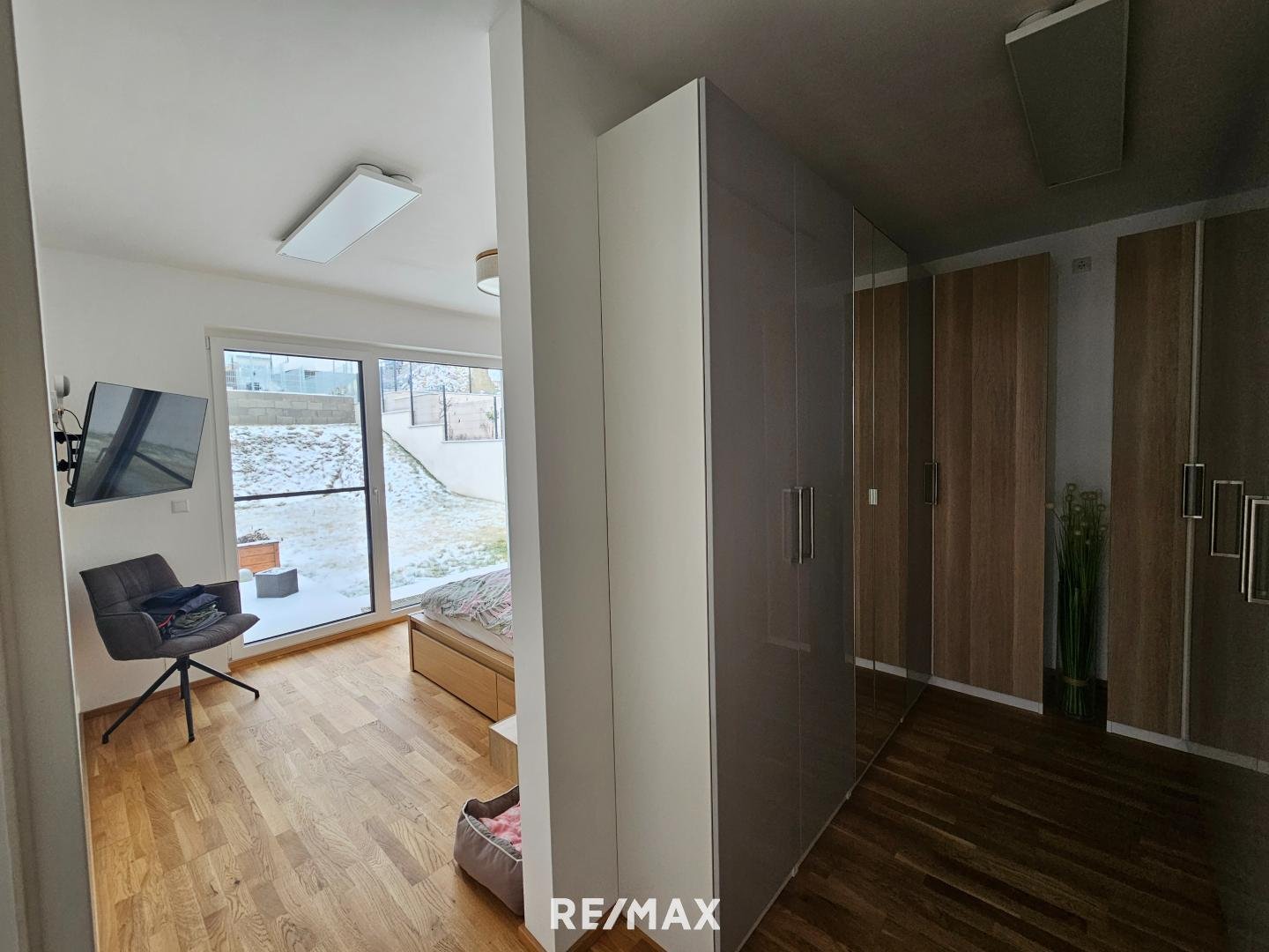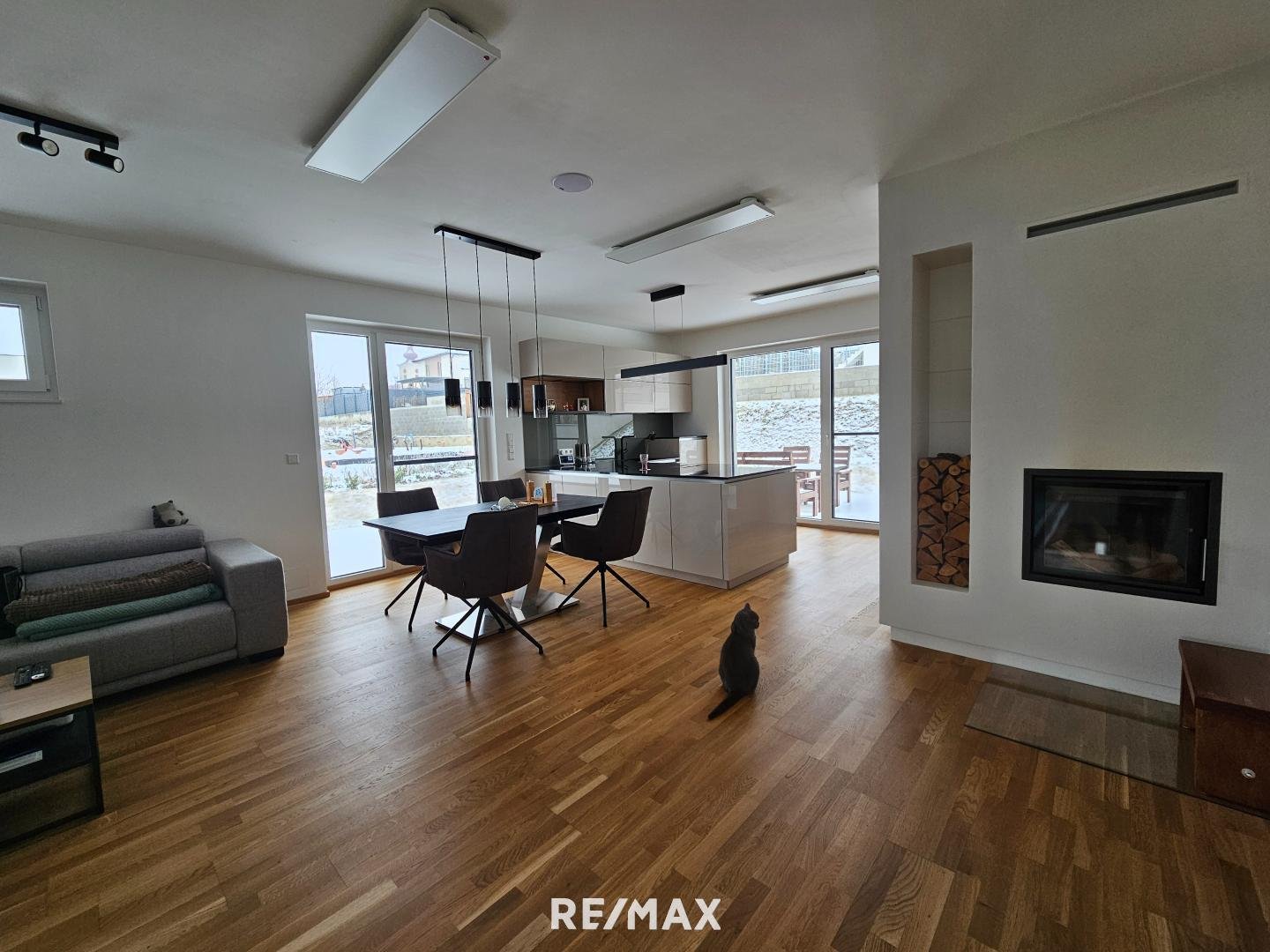 Durch die Glasfronten sieht man in den Garten - dieser kann noch schön angelegt werden. Eine Terrasse lädt zum gemütlichen Verweilen ein. Vom Garten kommt man über Stiegen wiederum in die Garage - diese ist auch direkt mit dem Wohnhaus verbunden.