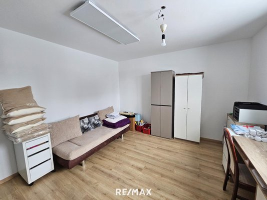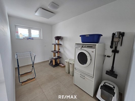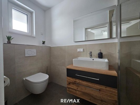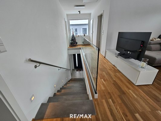 Im Obergeschoß kommt man über den Stiegenaufgang in den Wohn-Essbereich mit Küche, 2 Zimmer (eines mit Schrankraum), einen Hauswirtschaftsraum, 1 Bad mit Wanne und Dusche und 1 WC.