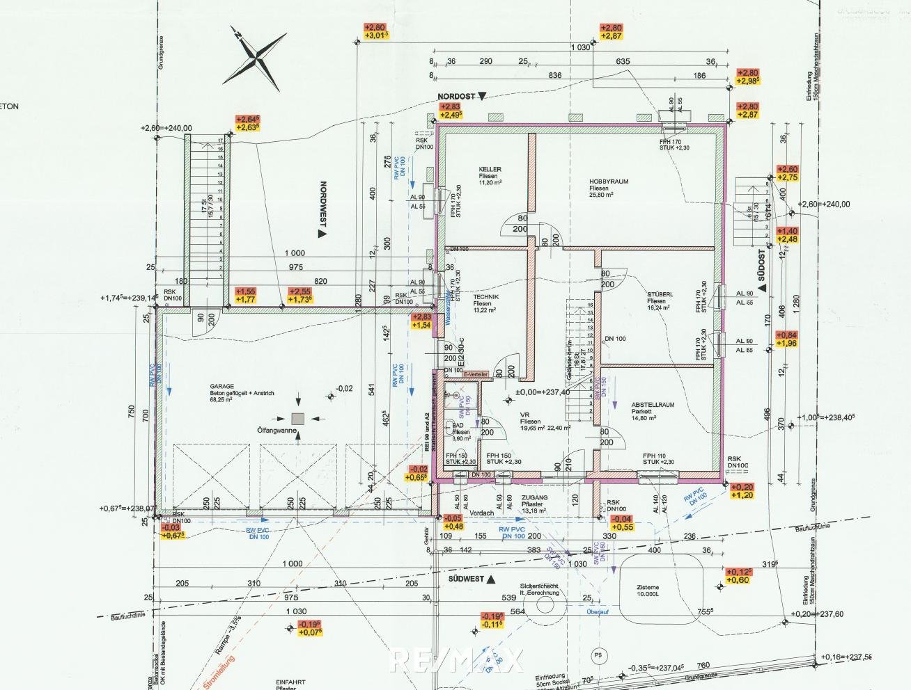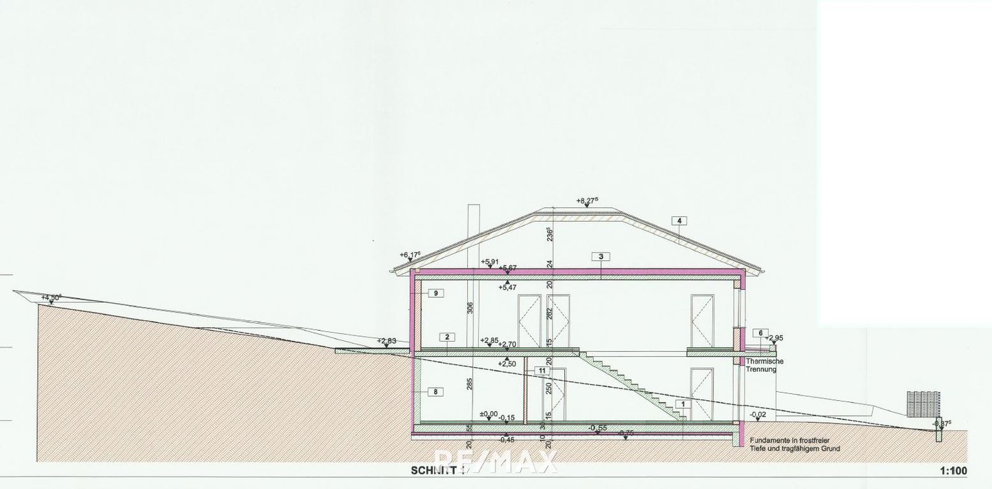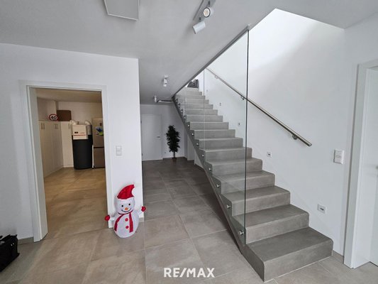 Im Erdgeschoß befinden sich 3 Garagen, ein Technikraum, ein Vorraum mit dem Stiegenaufgang ins Obergeschoß, ein WC mit Dusche und 4 Räume (siehe Plan bei Fotos).