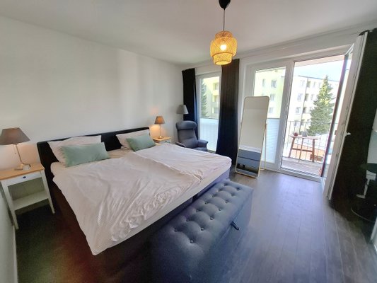 Das ruhig zum Innenhof gelegene Schlafzimmer bietet einen idealen Rückzugsort. Von hier aus gelangen Sie auf den überdachten Balkon, der auch bei typisch Hamburger Wetter zum Entspannen einlädt und durch seine geschützte Lage besonders ruhig ist.