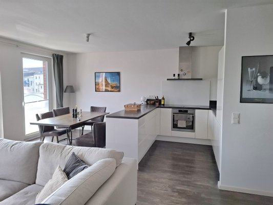 Das Herzstück der Wohnung bildet die großzügige Wohnküche, die als offener Lebensmittelpunkt viel Raum für Kochen, Leben und geselliges Beisammensein bietet. Großzügige Fensterflächen sorgen für eine helle und einladende Atmosphäre.