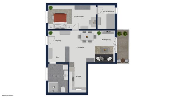 Auf ca. 65 m² Wohnfläche überzeugt ein durchdachter und optimal nutzbarer Grundriss, der sowohl Funktionalität als auch Wohnqualität in den Fokus stellt. Das Schlafzimmer bietet mit einer praktischen, begehbaren Ankleide zusätzlichen Komfort und Raum für individuelle Gestaltung.