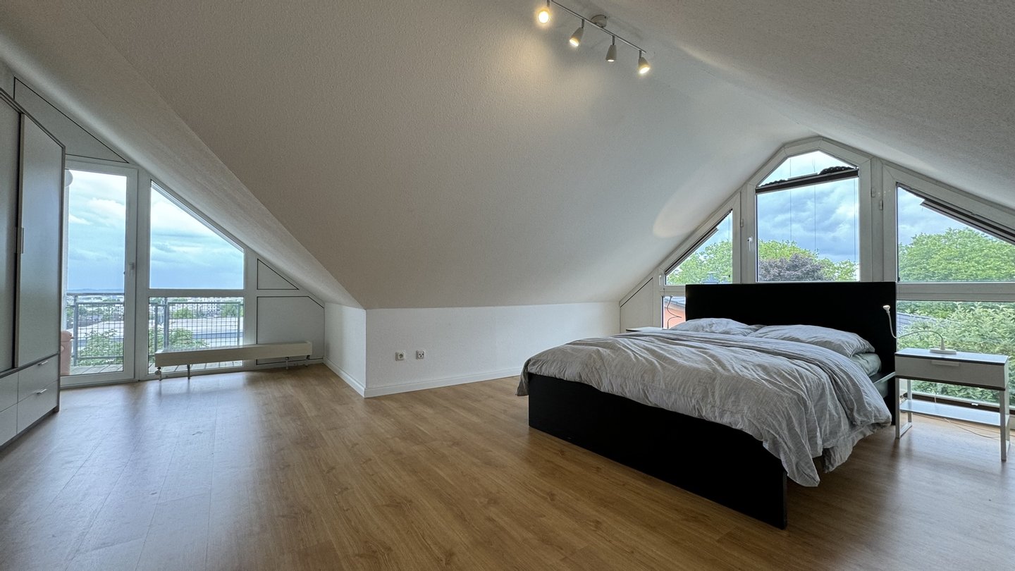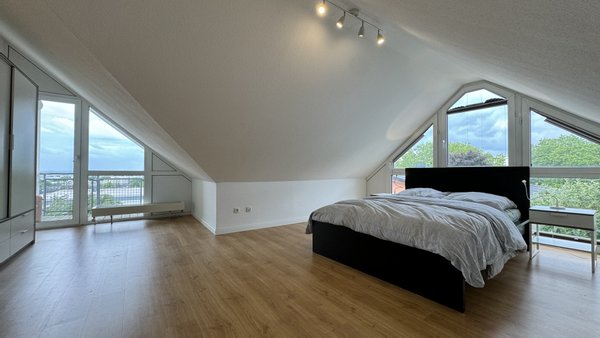 Über eine innenliegende Treppe gelangen Sie in das 3. Obergeschoss, wo sich ein großes Schlafzimmer mit viel Platz und weiteren Stauflächen unter der Dachschräge befindet. Auch hier befindet sich eine weitere Loggia, die Ruhe und Weitblick bietet.