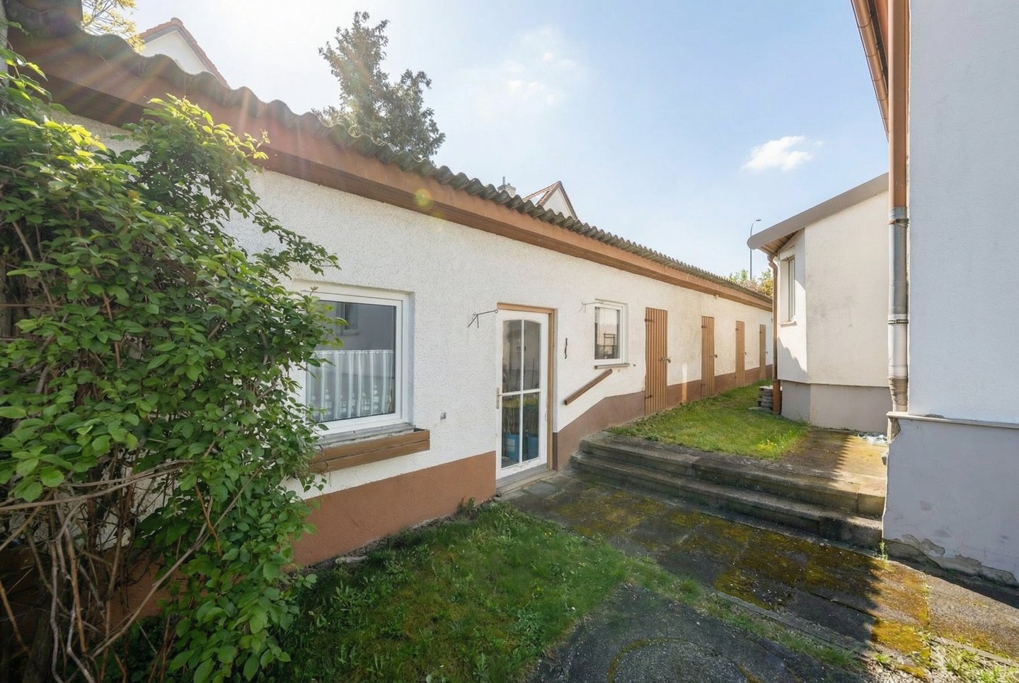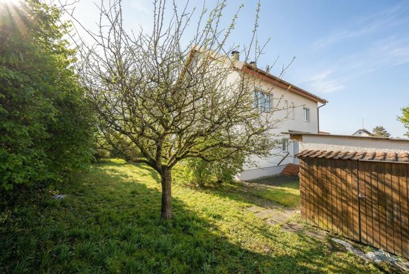 Das Grundstück selbst unterstreicht den Charakter dieser Immobilie: ein großzügiger Garten, teilweise nicht einsehbar, mit Apfel- und Zwetschgenbaum, bietet viel Platz für Kinder, Ruhe und Gestaltungsideen. Ergänzt wird das Ganze durch eine Doppelgarage, eine Werkstatt, einen Waschraum sowie zusätzliche Lagerflächen im hinteren Teil des Grundstücks.