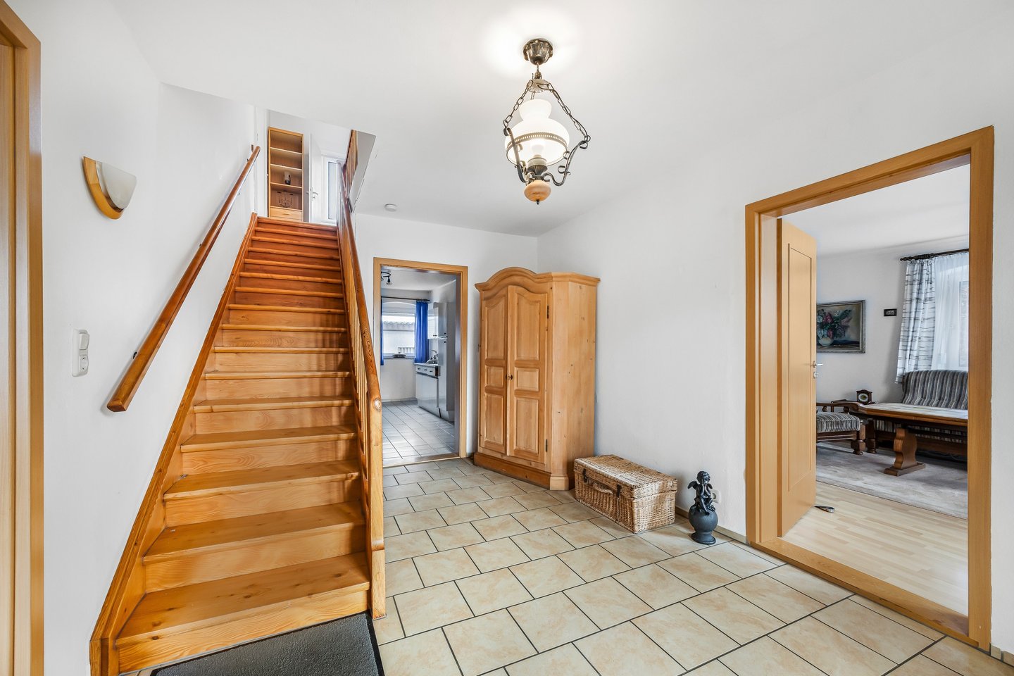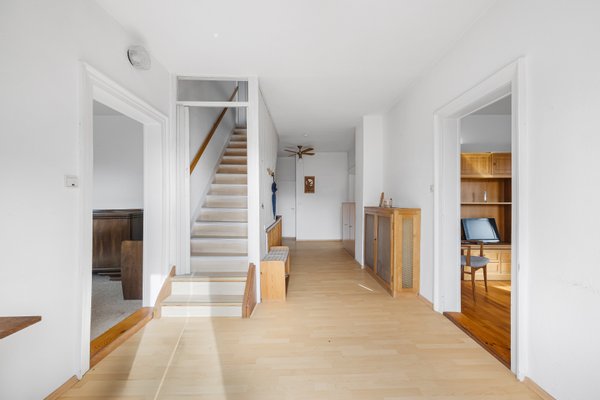 Schon beim Betreten fällt der weite Eingangsbereich im Erdgeschoss auf, der sich offen im Haus verteilt und den Zugang zu den Wohnräumen schafft. Auf dieser Ebene stehen drei gut nutzbare Zimmer, eine Küche sowie ein Badezimmer mit Dusche und ein separates WC zur Verfügung. Zwei vorhandene Kaminschächte bieten zusätzliche Möglichkeiten für eine zukünftige Gestaltung.