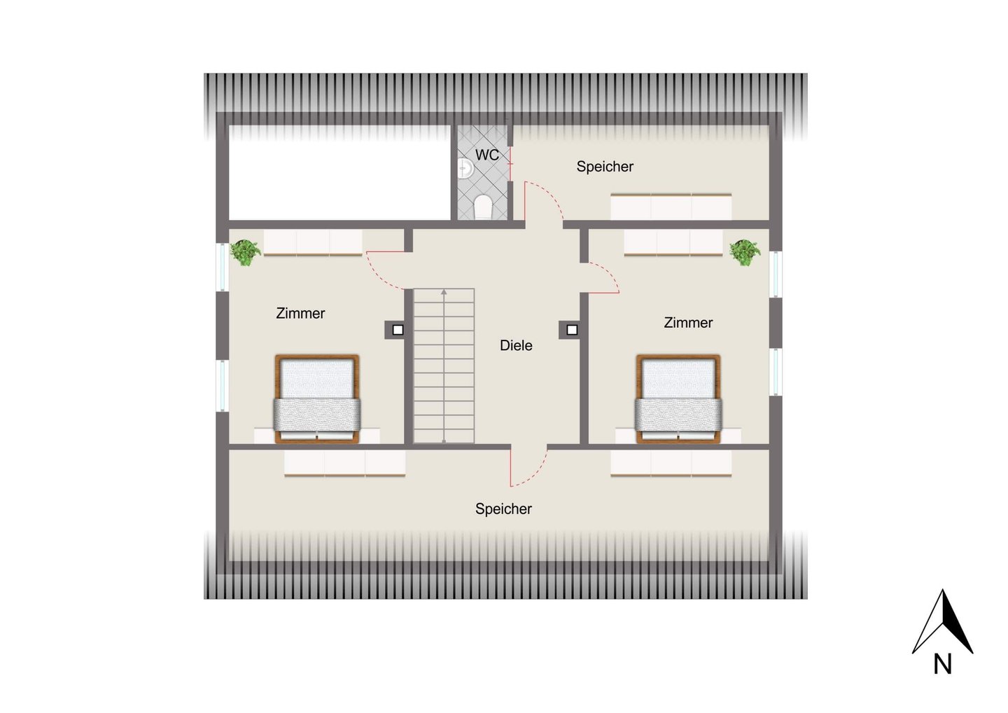 Das ausgebaute Dachgeschoss eröffnet zusätzliche Nutzungsmöglichkeiten, ob als Rückzugsort für Jugendliche, Arbeitsbereich oder Gästeebene. Zwei weitere Zimmer, zusätzliche Speicherflächen sowie ein weiteres WC schaffen hier eine flexible Erweiterung des Hauses.