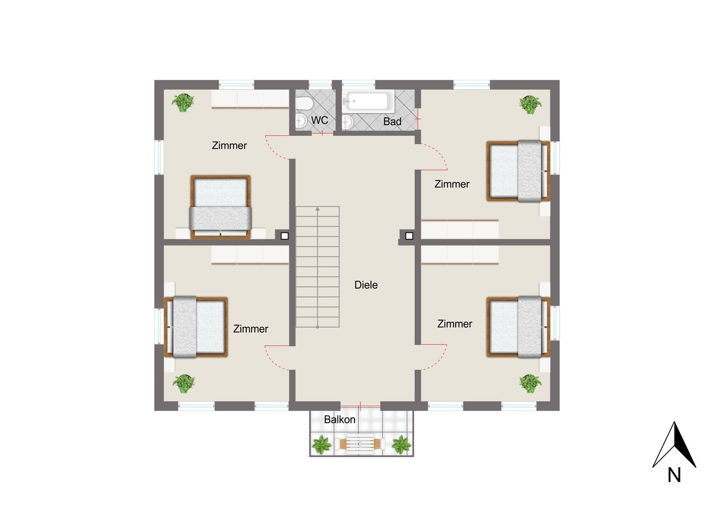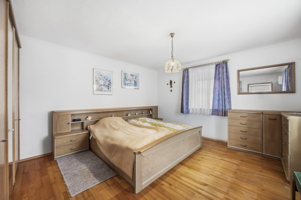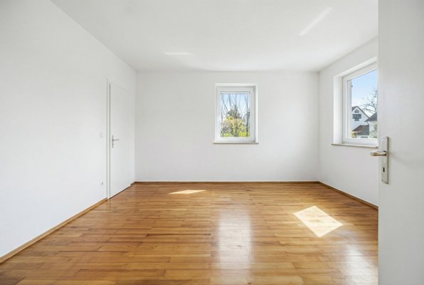 Im Obergeschoss setzt sich das großzügige Raumgefühl fort: vier große Schlafzimmer schaffen ideale Voraussetzungen für Familien mit mehreren Kindern oder für die Kombination aus Wohnen und Arbeiten. Eines der Zimmer lässt sich bequem zur Küche umfunktionieren, da hier bereits alle Anschlüsse vorhanden sind. Der Südbalkon erweitert den Wohnraum nach außen und bietet einen angenehmen Platz für sonnige Stunden. Ergänzt wird diese Etage durch ein weiteres Bad und ein separates WC.