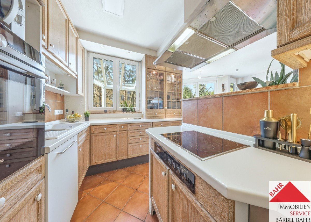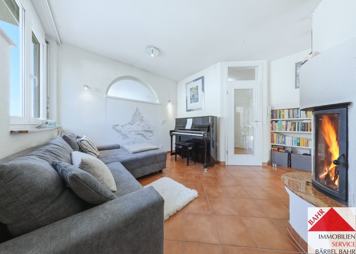 Das Herzstück der Wohnung ist das helle Wohnzimmer im Obergeschoss mit einem wohlig warmen Kachelofen und der gemütliche Essbereich an einer großen Fensterfront, der fließend in die offene Küche übergeht und eine einladende Wohnatmosphäre schafft. Von hier aus gelangen Sie direkt auf den Balkon mit Zugang zur Terrasse und einem kleinen, privaten Gartenanteil – ideal zum Entspannen oder für gesellige Stunden im Freien.