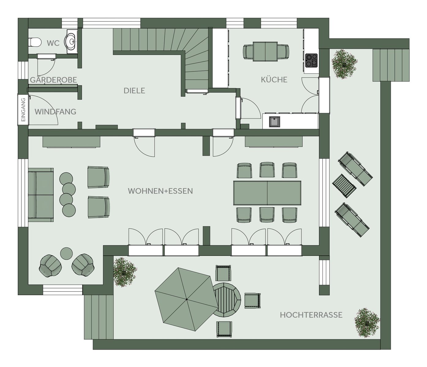 Die zeitlos elegante Ausstattung gibt dem Haus eine ruhige und entspannende Atmosphäre. Dazu passend, wird der geräumig geschnittene Grundriss im Erdgeschoss durch Terrassenflächen nach Süden und Osten ergänzt. Von hier führt eine Treppe in den großzügigen Garten, der sich durch die leichte Hanglage des Grundstücks in liebevoll gestaltete Bereiche gliedert. Hervorzuheben ist das in Wohnraumqualität ausgebaute Untergeschoss, mit eigenem Zugang von außen, das sich wunderbar als Homeoffice oder Gästebereich eignet.