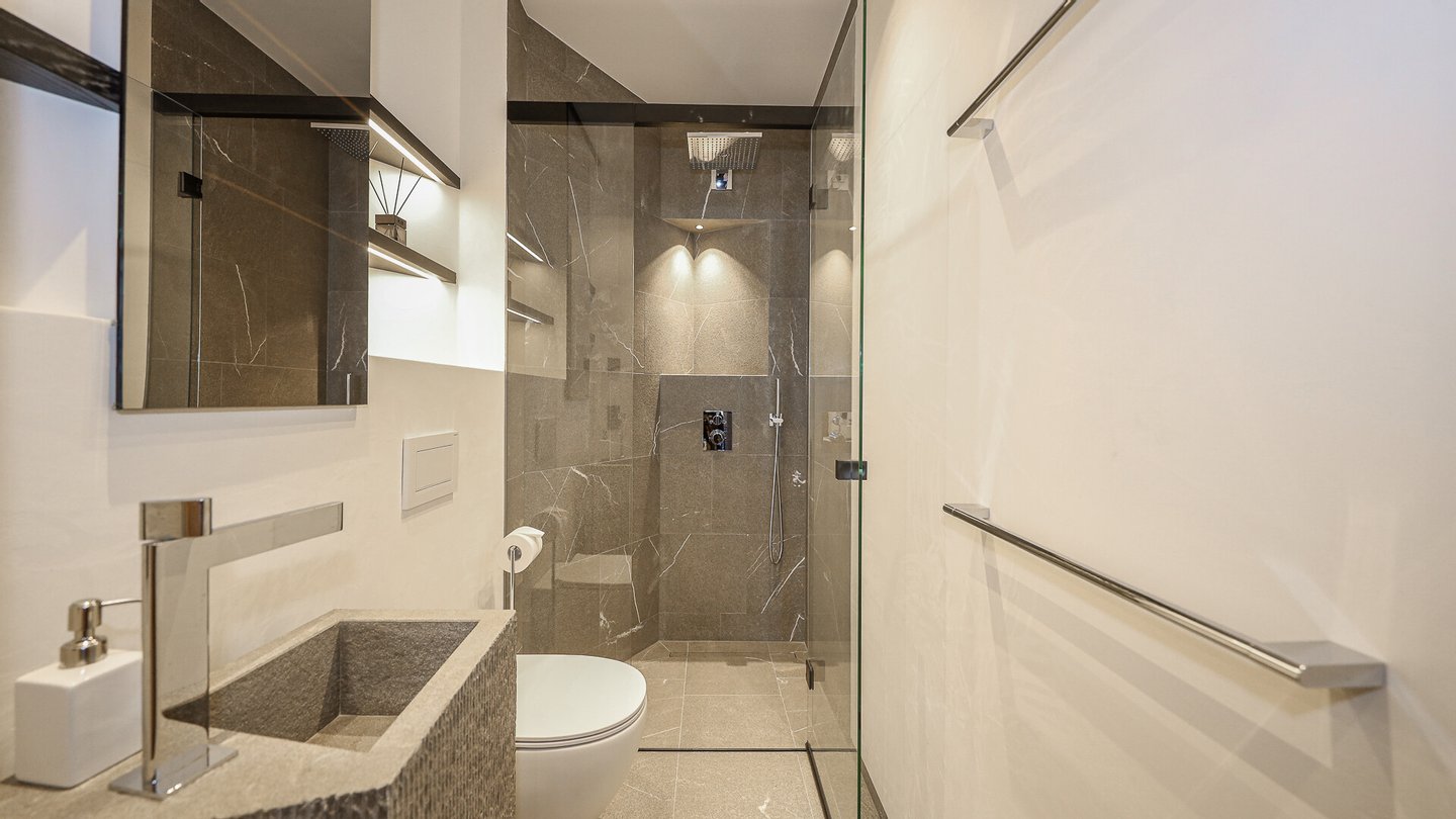 Die Wohnung verfügt im EG über 2 Gäste Schlafzimmer mit hochwertigen Bädern und einer Master-Suite mit freistehendem Doppelbett, Ankleidebereich und Schreibtisch. Dazu gehört ein sehr großes helles über 21 m² großes Luxusbadezimmer mit Oberlicht, viel Stein, extra WC und Saunabereich.