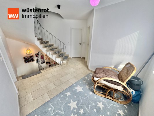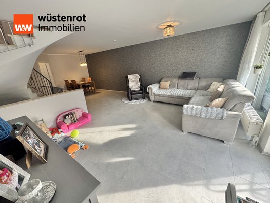 Im Erdgeschoss bildet der großzügige, lichtdurchflutete Wohn- und Essbereich das Herz des Hauses. Hier spielt sich das Leben ab: gemeinsame Mahlzeiten, gemütliche Abende und der direkte Zugang zur sonnigen West-Terrasse mit Markise und in den Garten. Ein Ort, an dem Kinder spielen und Sie den Alltag hinter sich lassen können. Die offene, galerieähnliche Treppe sorgt dabei für ein angenehmes, luftiges Wohngefühl.