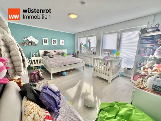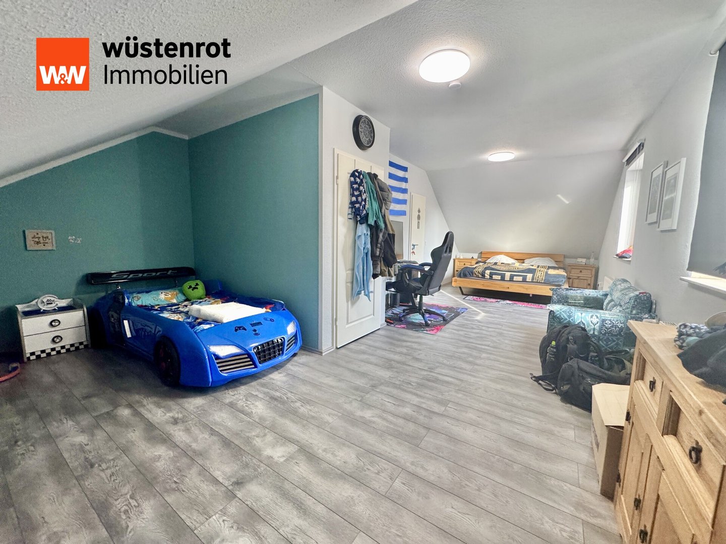 Drei gut geschnittene Schlafzimmer bieten ausreichend Platz für die ganze Familie. Besonders das ausgebaute Dachgeschoss mit eigenem Tageslichtbad schafft einen schönen Rückzugsort – sei es für Eltern oder ältere Kinder. Zwei weitere Schlafzimmer sowie ein zusätzliches Bad im Obergeschoss ergänzen das Raumangebot perfekt.