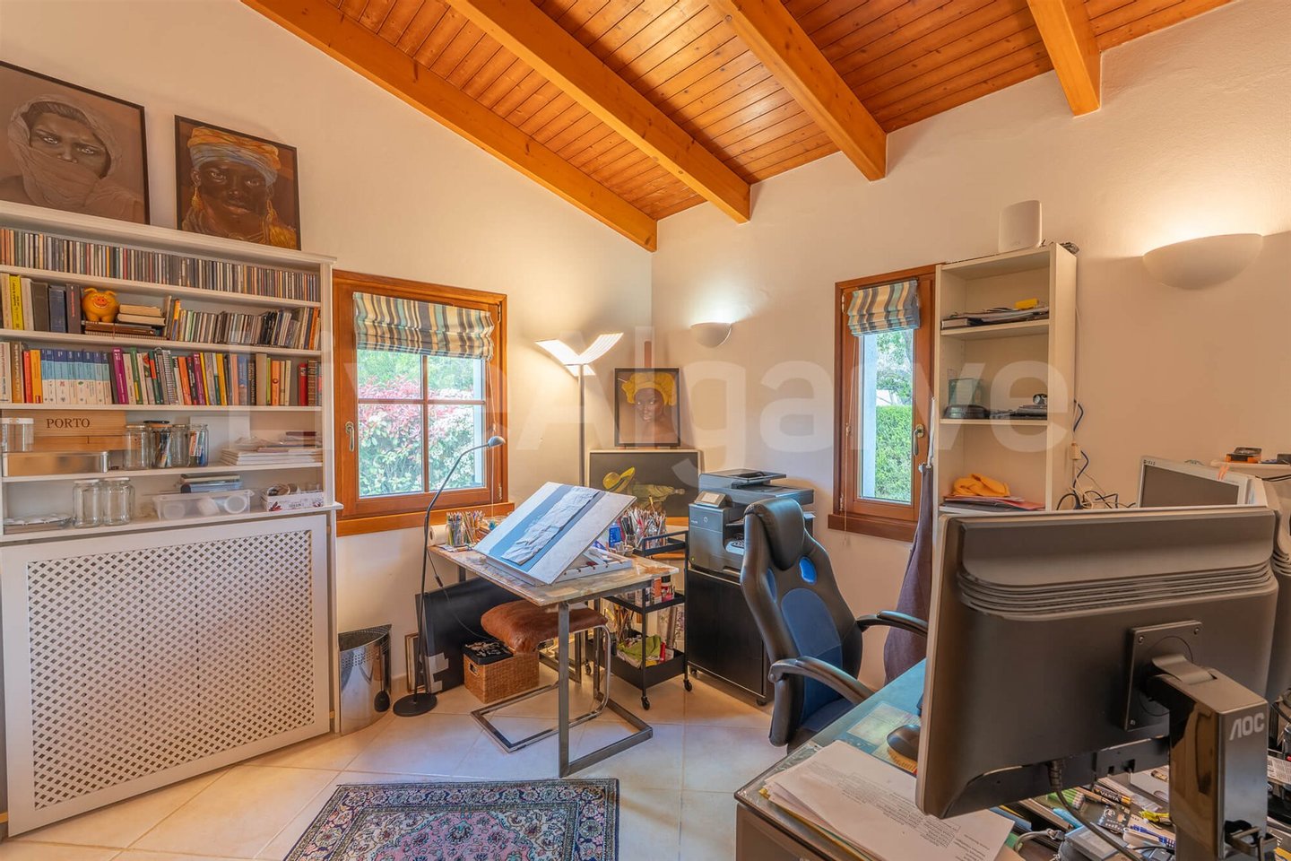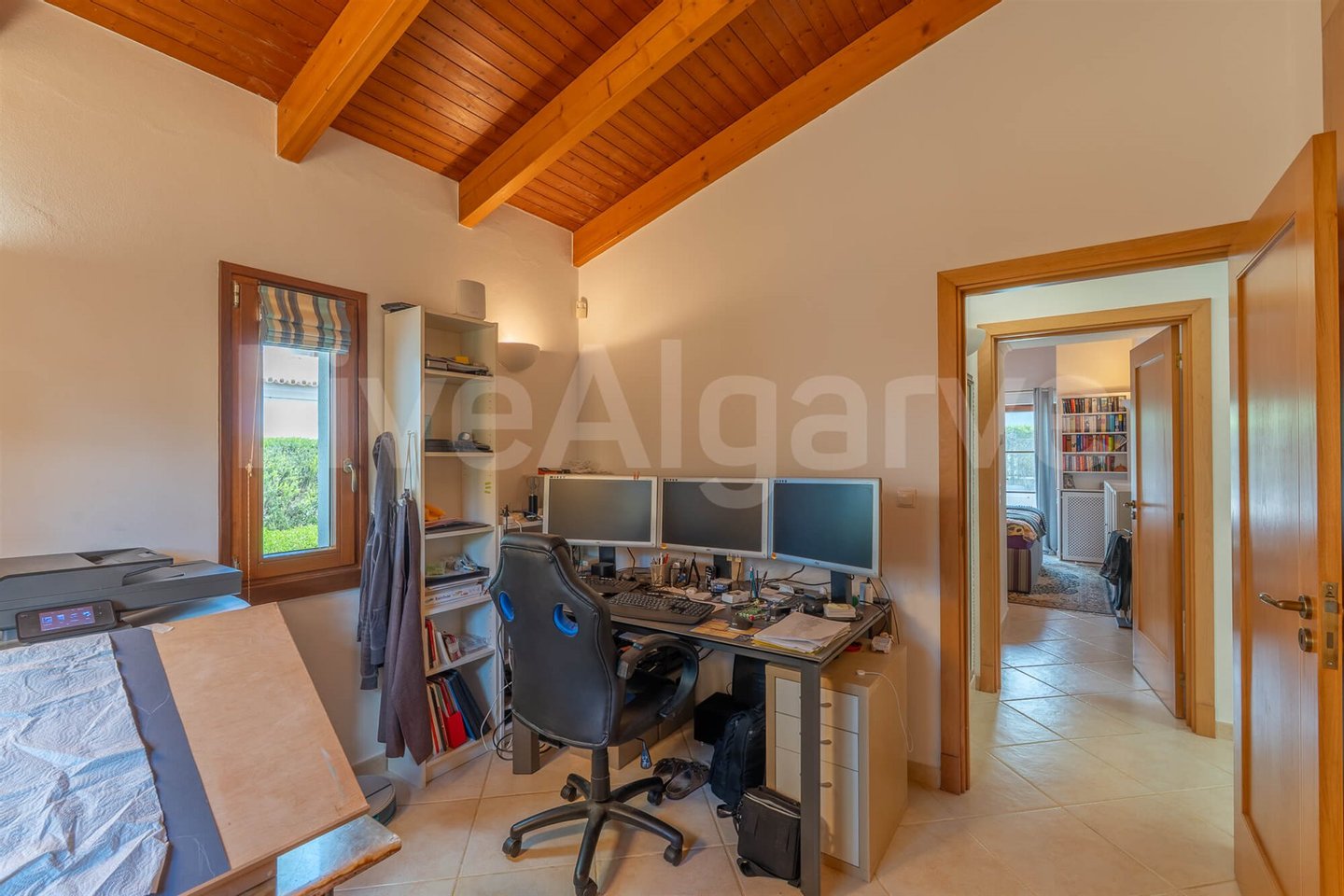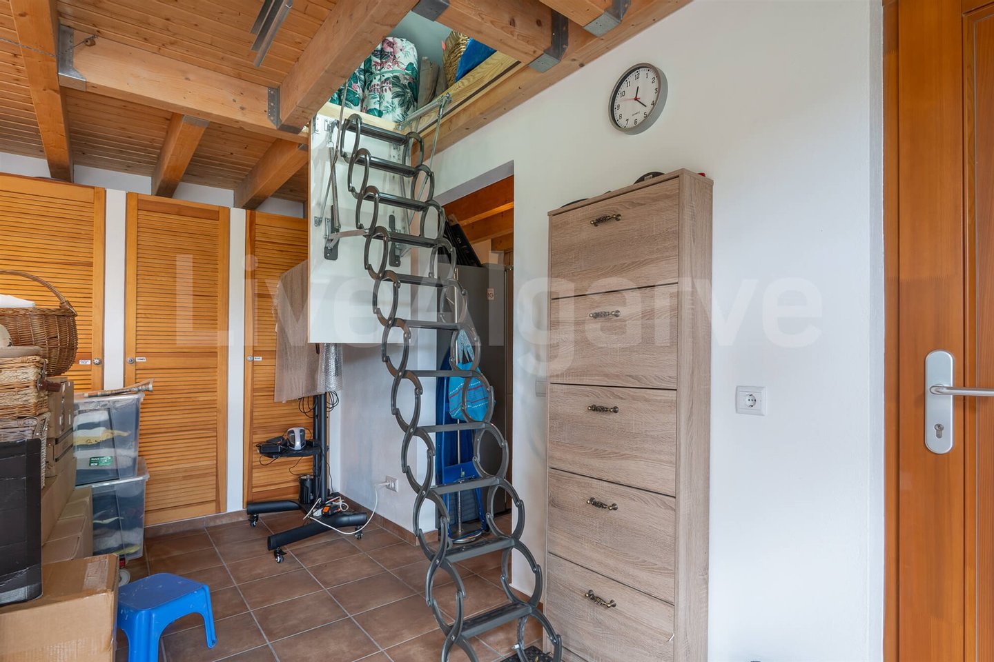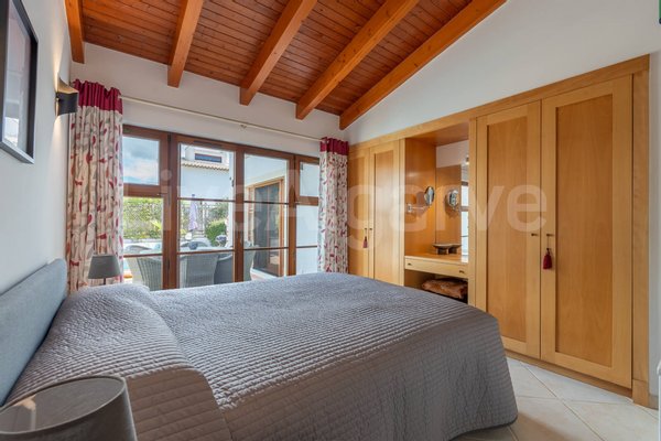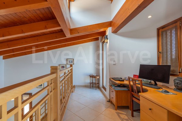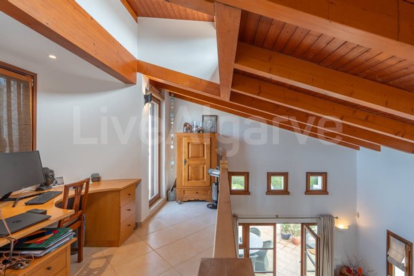 Eine Holz-Mezzanin, über eine gut gestaltete Treppe erreichbar, dient als erhöhter Arbeitsbereich. Seine Platzierung ermöglicht Trennung bei gleichzeitiger Verbindung zu den Hauptwohnräumen, ideal für Remote-Arbeit. Das Mezzanin bietet direkten Zugang zu einer Terrasse, erweitert nutzbaren Raum und nutzt das Klima der Algarve.