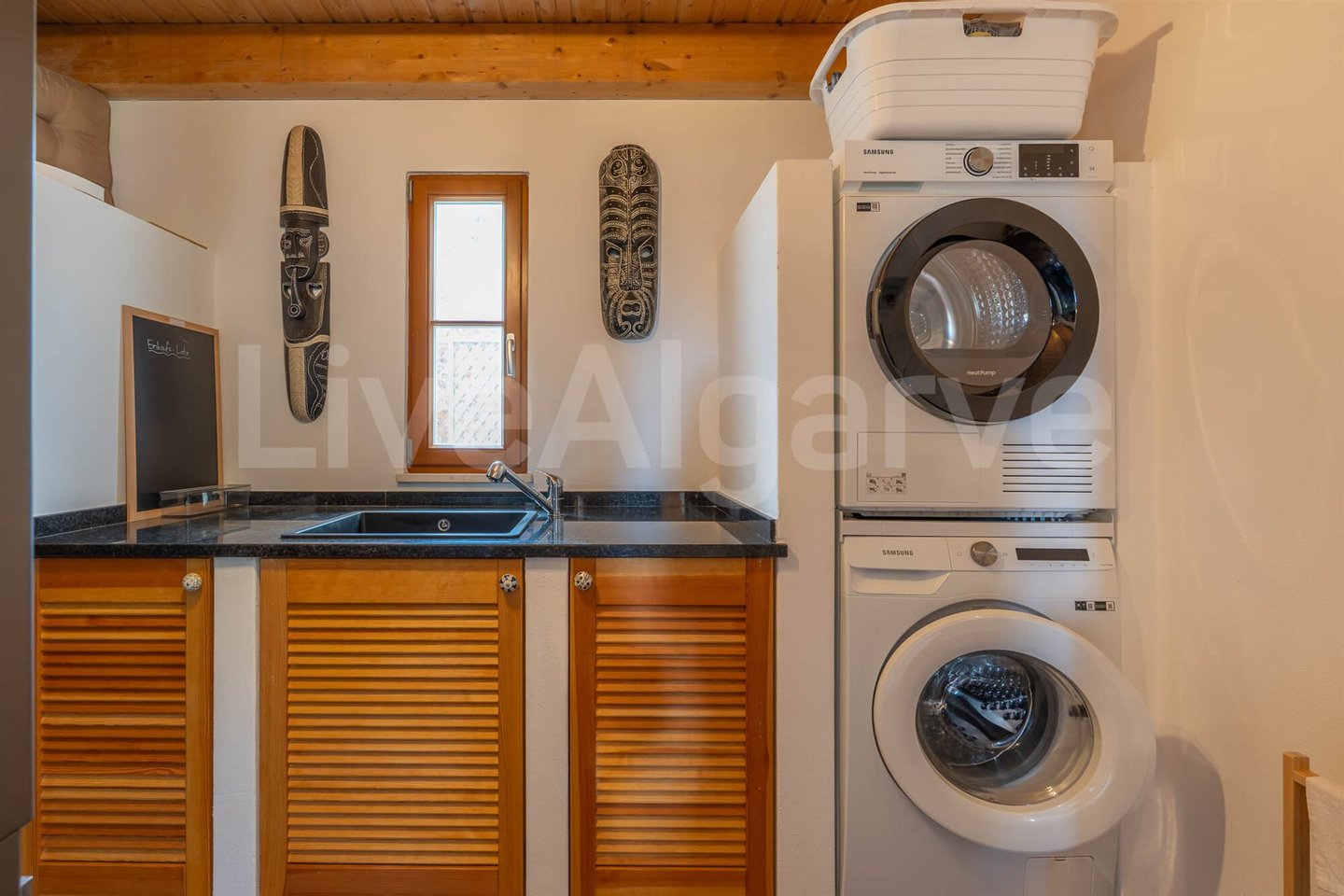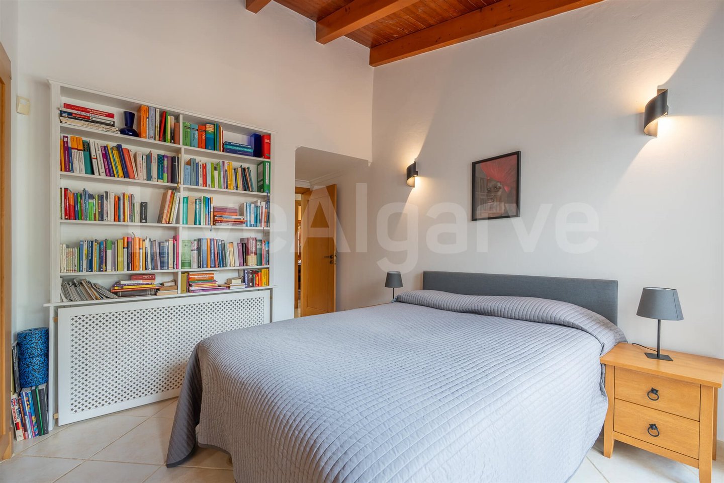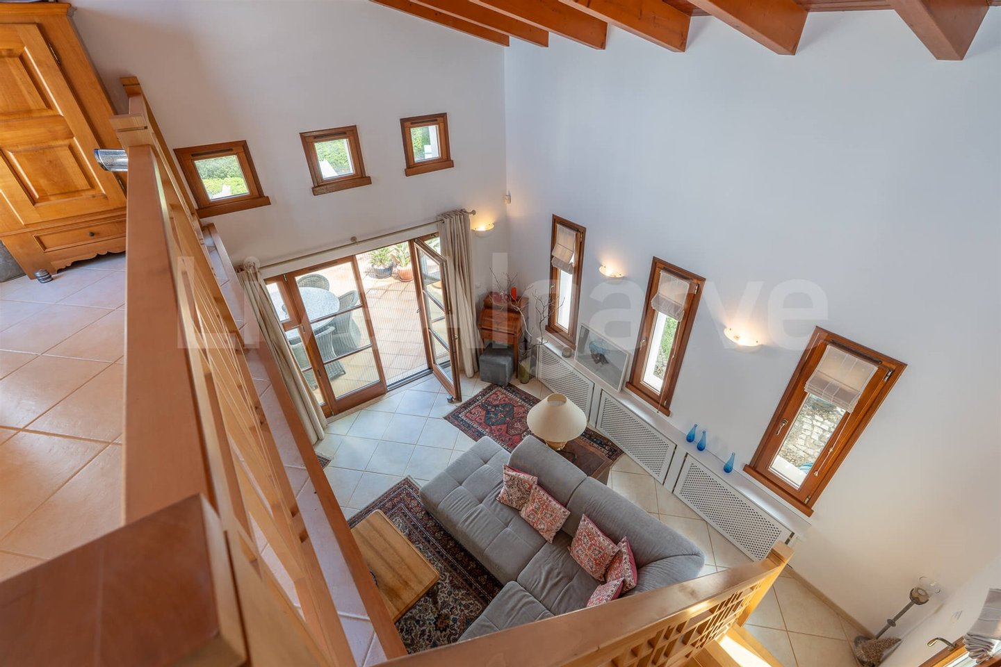 Eine Holz-Mezzanin, über eine gut gestaltete Treppe erreichbar, dient als erhöhter Arbeitsbereich. Seine Platzierung ermöglicht Trennung bei gleichzeitiger Verbindung zu den Hauptwohnräumen, ideal für Remote-Arbeit. Das Mezzanin bietet direkten Zugang zu einer Terrasse, erweitert nutzbaren Raum und nutzt das Klima der Algarve.