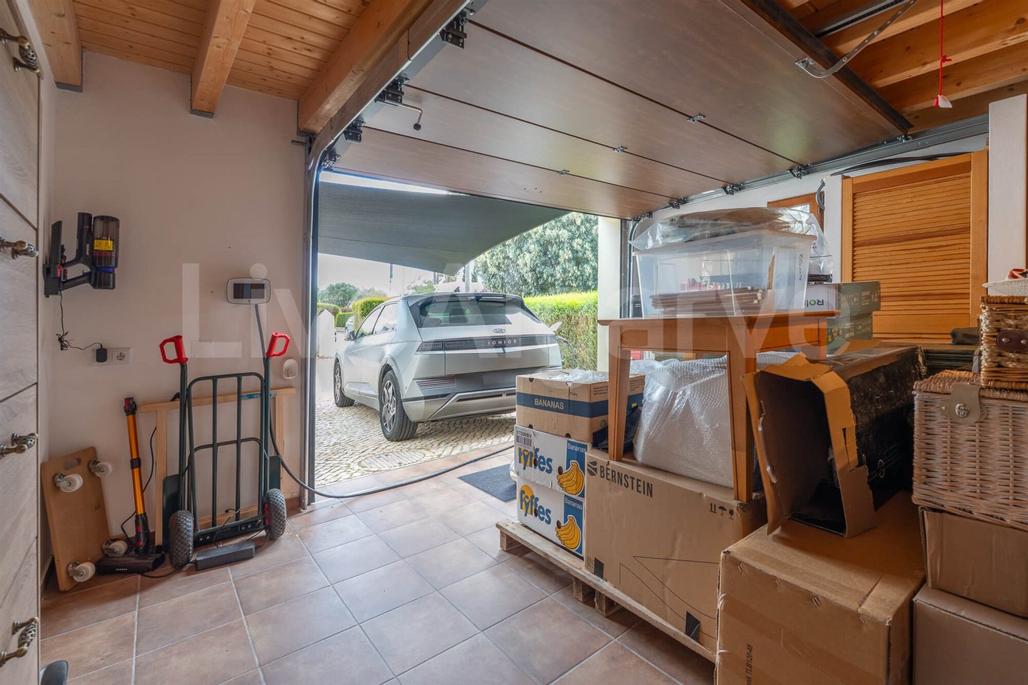 Die große Garage bietet integrierte Lagermöglichkeiten, einen Waschbereich und Vorinstallation für das Aufladen von Elektrofahrzeugen. Dachboden darüber erstreckt sich über die gesamte Garage und bietet zusätzlichen Stauraum.