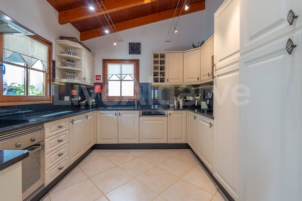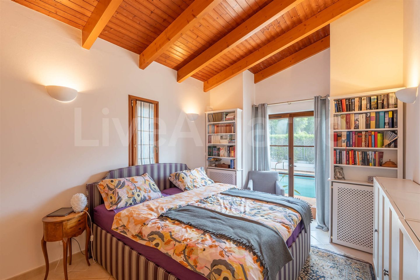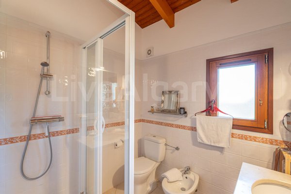 Die 3 Schlafzimmer sind praktisch angeordnet, jedes mit Einbauschränken. Zwei Schlafzimmer verfügen über en-suite Badezimmer und direkten Zugang zum Poolbereich. Das dritte Schlafzimmer, derzeitals Büro genutzt, zeigt Flexibilität für veränderliche Bedürfnisse. Ein zusätzliches Bad mit Badewanne dient dem Rest des Hauses. Alle Badezimmer haben Fußbodenheizung für zusätzlichen Komfort.