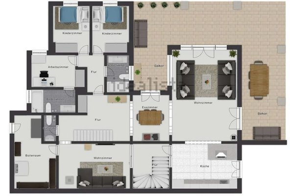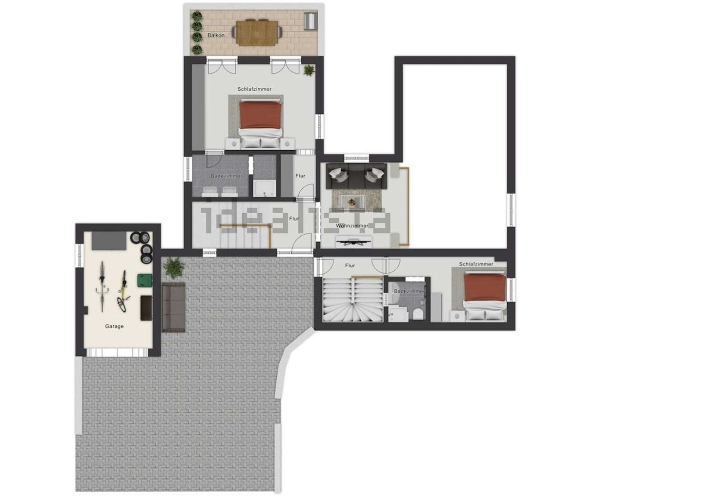 Im Innenbereich sorgen hohe Decken, sichtbare Holzbalken und große Fensterflächen für ein offenes und lichtdurchflutetes Wohngefühl. Die Immobilie verfügt über: