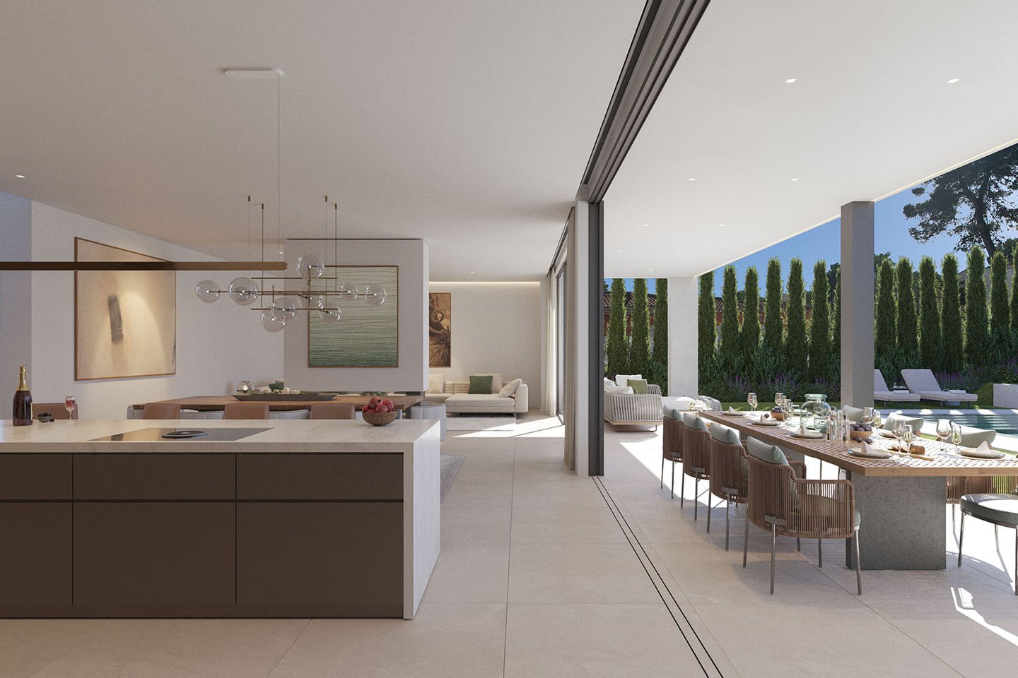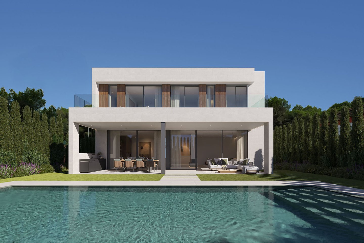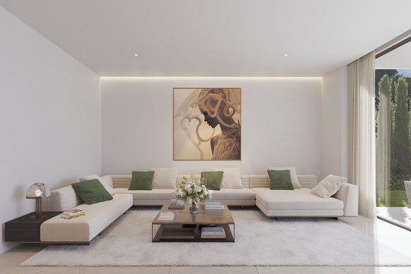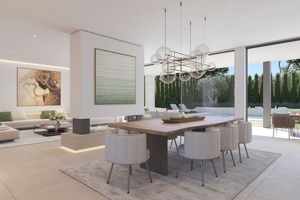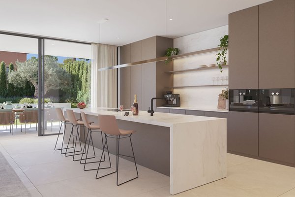 Die Immobilie erstreckt sich über drei Ebenen und beeindruckt durch ihre klare, zeitgemäße Architektur mit eleganten Fassaden und großzügigen Fensterflächen. Im Inneren entsteht ein offenes, lichtdurchflutetes Wohnkonzept, bei dem Wohn-, Ess- und Küchenbereich harmonisch ineinander übergehen. Eine Designerküche mit Markengeräten fügt sich dabei nahtlos in das moderne Gesamtbild ein und erfüllt höchste Ansprüche an Funktionalität und Ästhetik. Hochwertige Materialien wie edle Natursteinböden und warme Parkettflächen unterstreichen den luxuriösen Charakter und schaffen eine angenehme Wohnatmosphäre. Große Schiebetüren öffnen den Wohnbereich nahtlos zur überdachten Terrasse und dem Garten mit Salzwasserpool.
